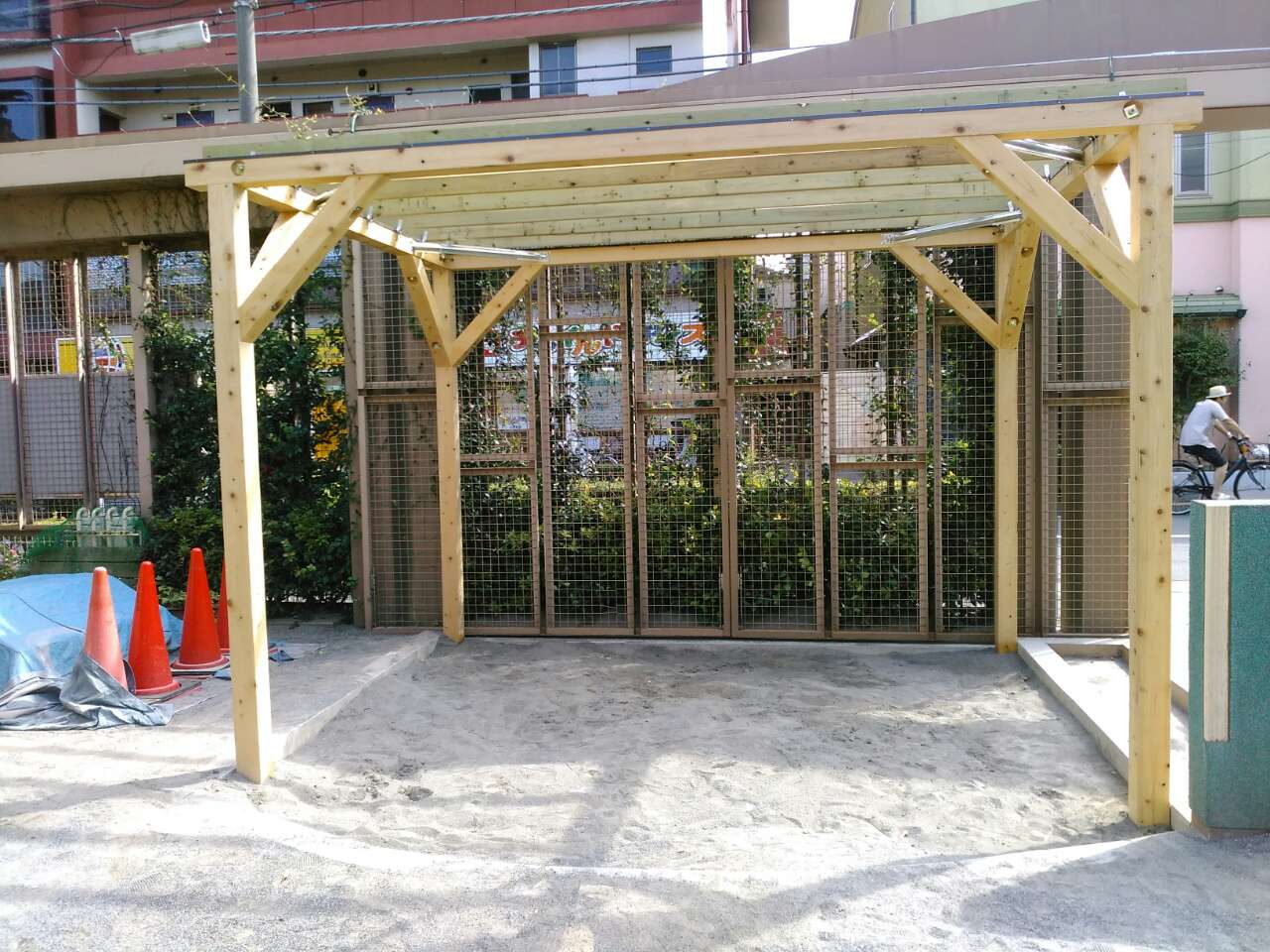 昨日・今日で、砂場の上に棚を作っていただきました。 棚の上を這うような植木を植えて子どもたちが遊ぶ時に、日差しが直接当たらないようにするためです。