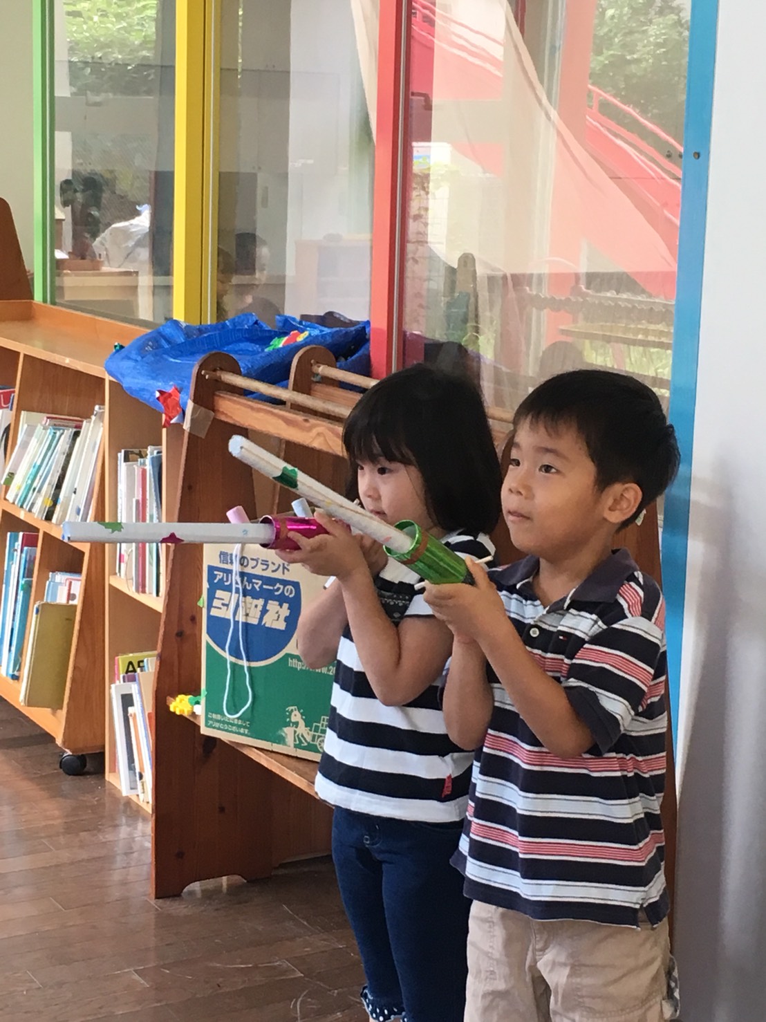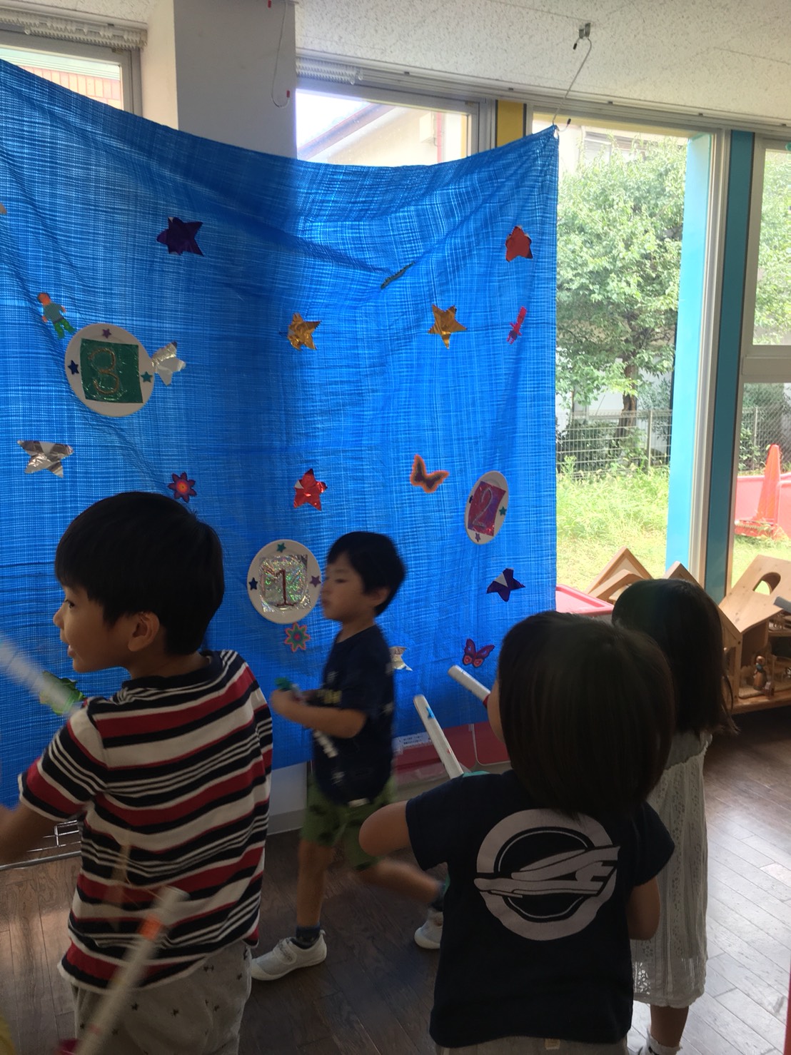 子どもたちは「的あて」を見つけると大喜びです。真剣な表情で的を狙って、見事に当たると「当たった!」と大喜びです!順番に楽しんでいました♡