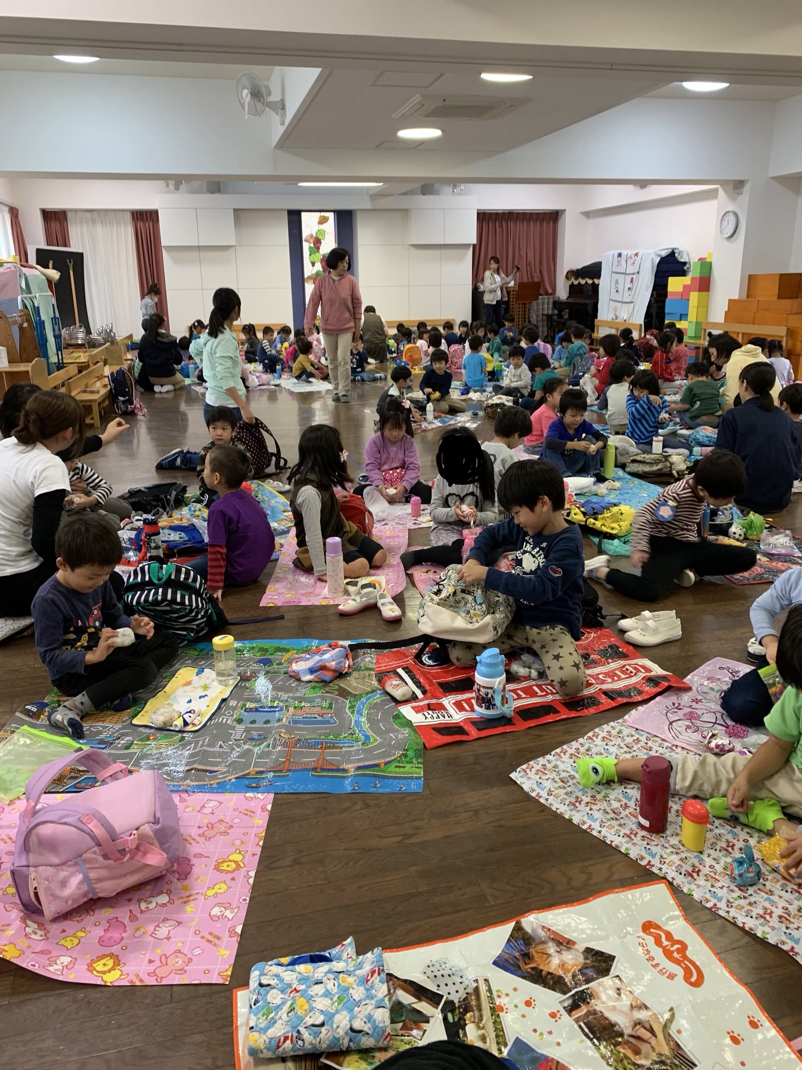 園内で、楽しく遊び…ホールで全員でシートを敷いて、お弁当を食べました。
