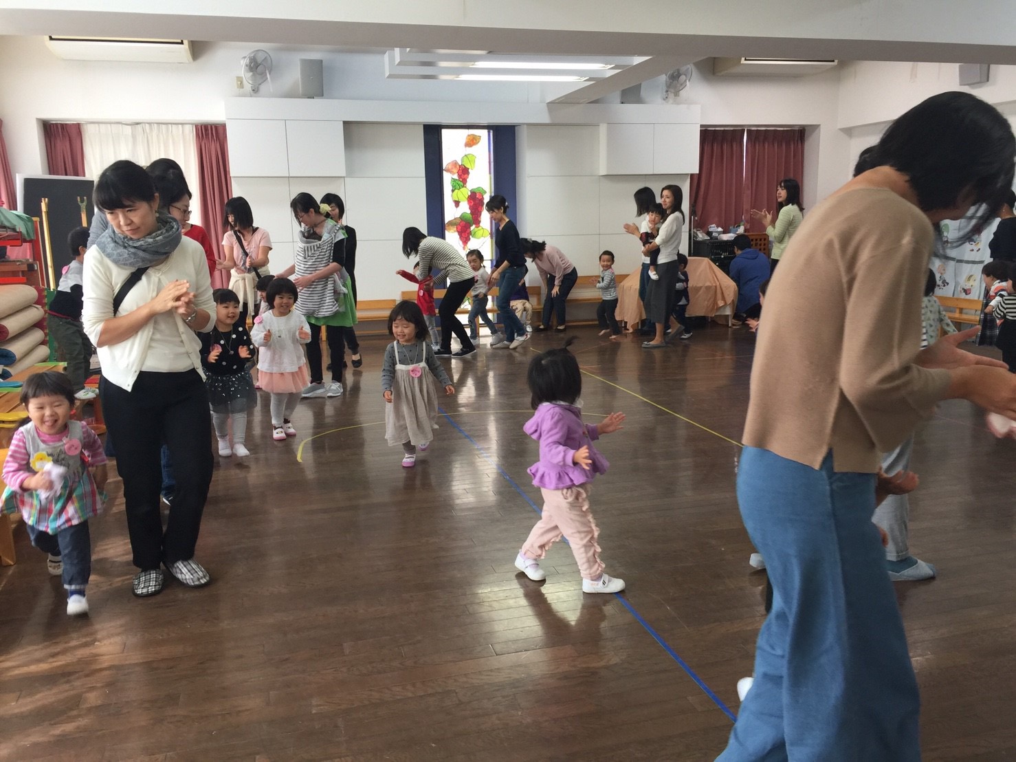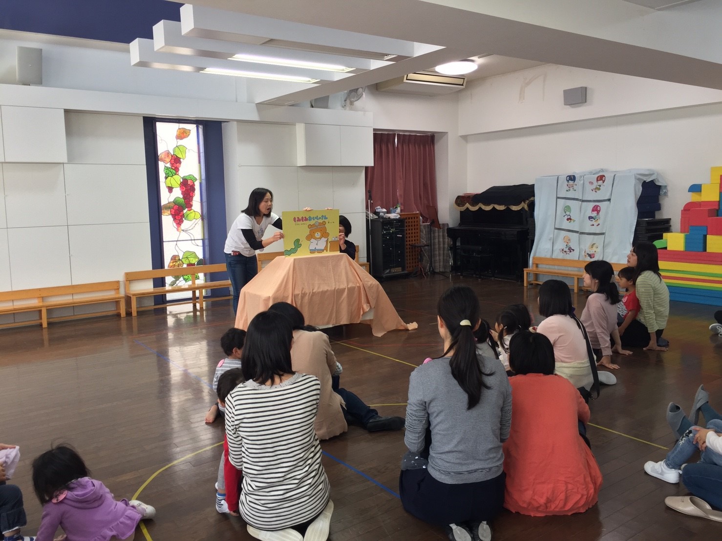 礼拝の後は大きな栗の木の下での歌に合わせてリトミックをし、お母さんのお膝の上で「もみもみおいしゃさん」の紙芝居を見ました。