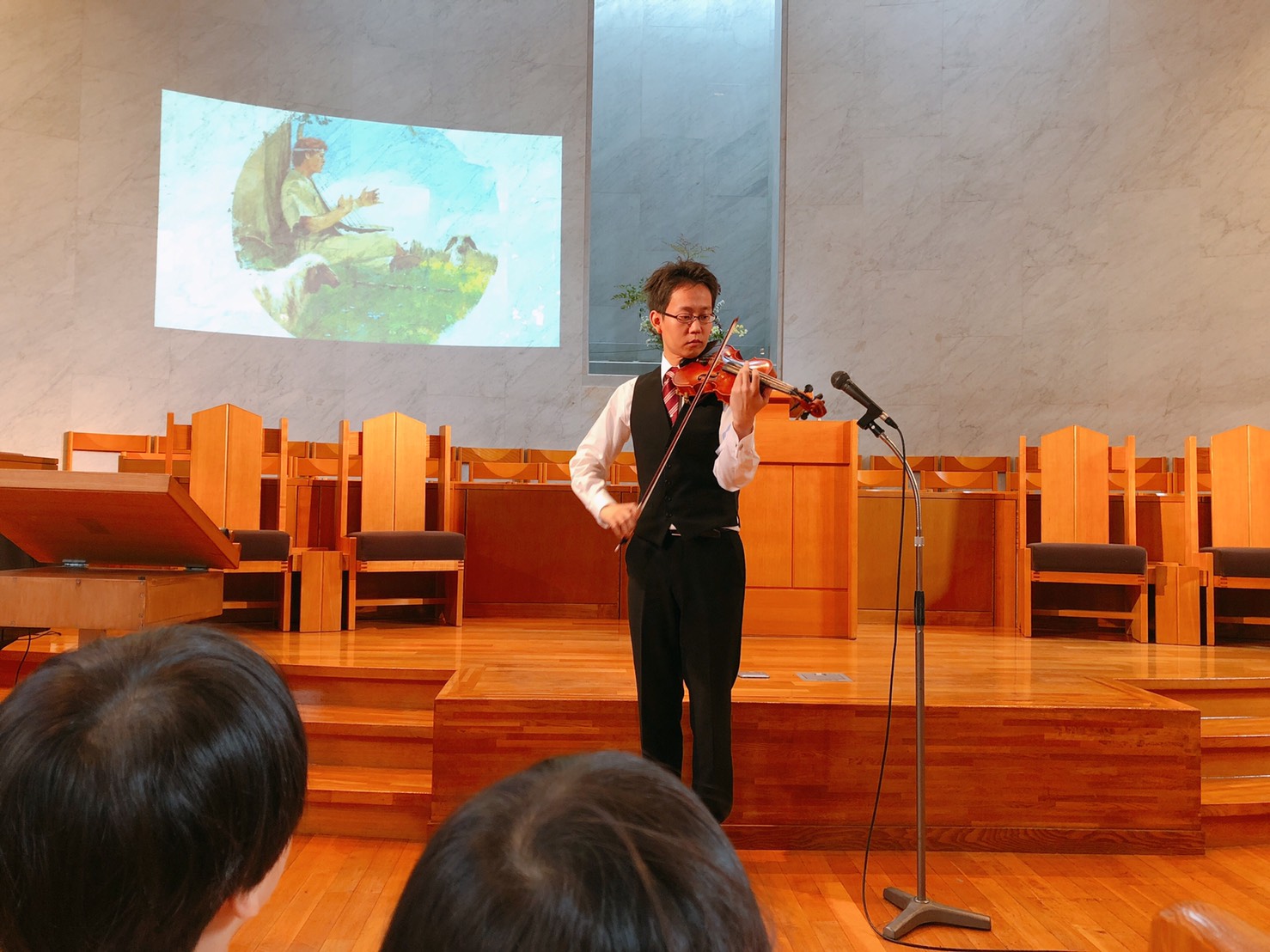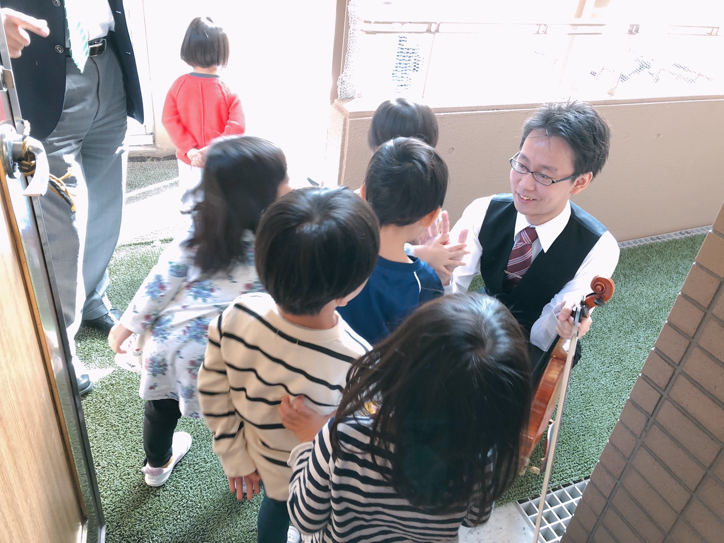 そして、お話のあとはめぐみ幼稚園の卒園生でもあるバイオリニスト、梅原さんが素敵なバイオリンの音色を届けてくれました。