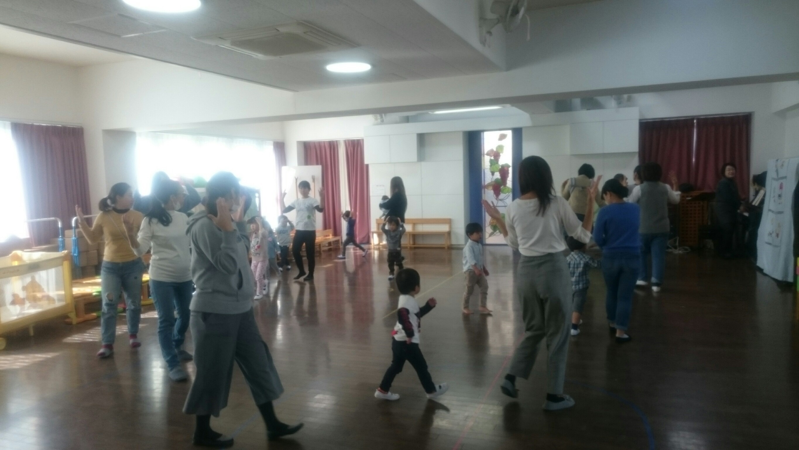 リトミックでは、どんぐりころころを歌ったり、ド・ミ・ソの音を聞き分けて、頭や肩に手を当てて、歩きましたね。きのこ体操は元気に踊ってましたね!