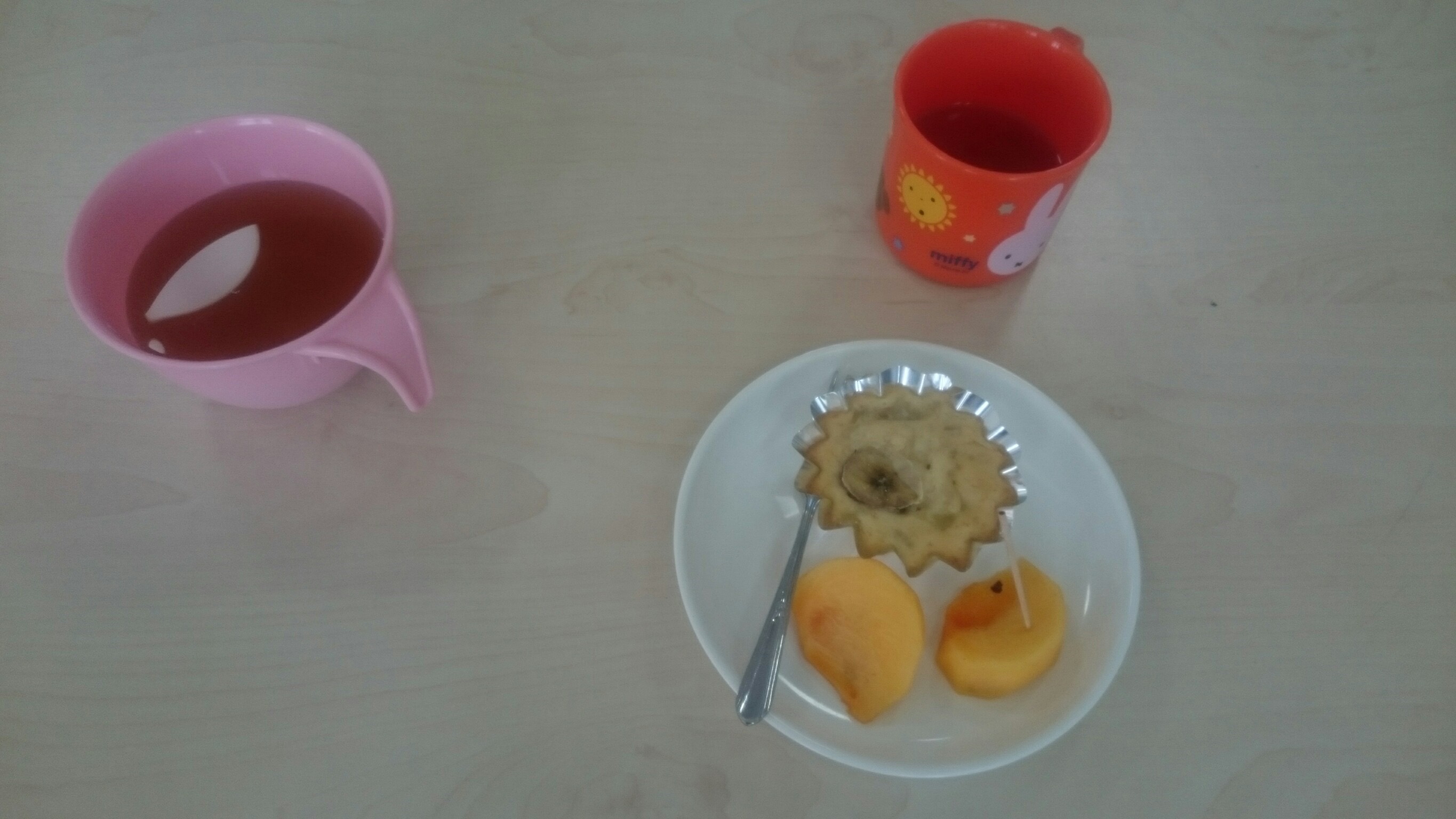 おやつは、手作りの米粉バナナ蒸しパンと柿でした。美味しかったですね。