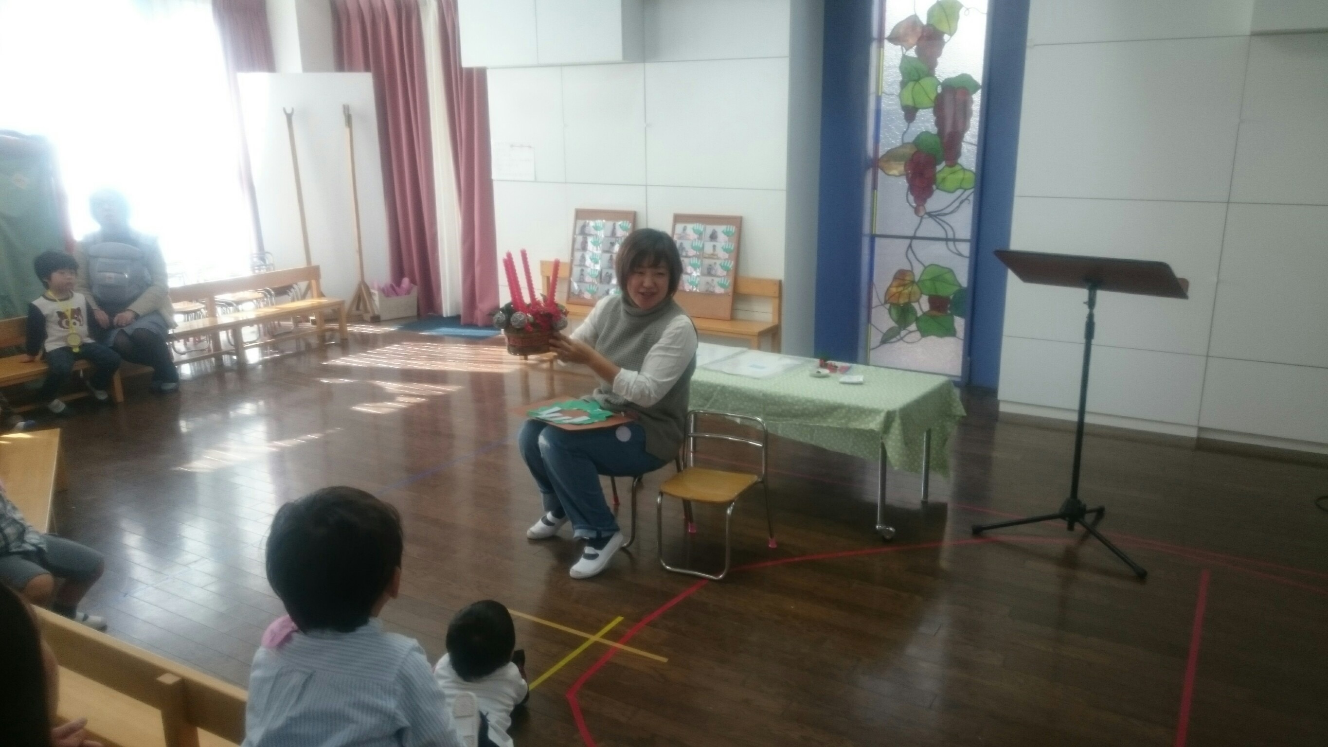 お片付けをして、もも組さんのお友だちが椅子を並べるお手伝いをしてくれて、めぐみ幼稚園のお兄さんお姉さんと合同礼拝をしました。