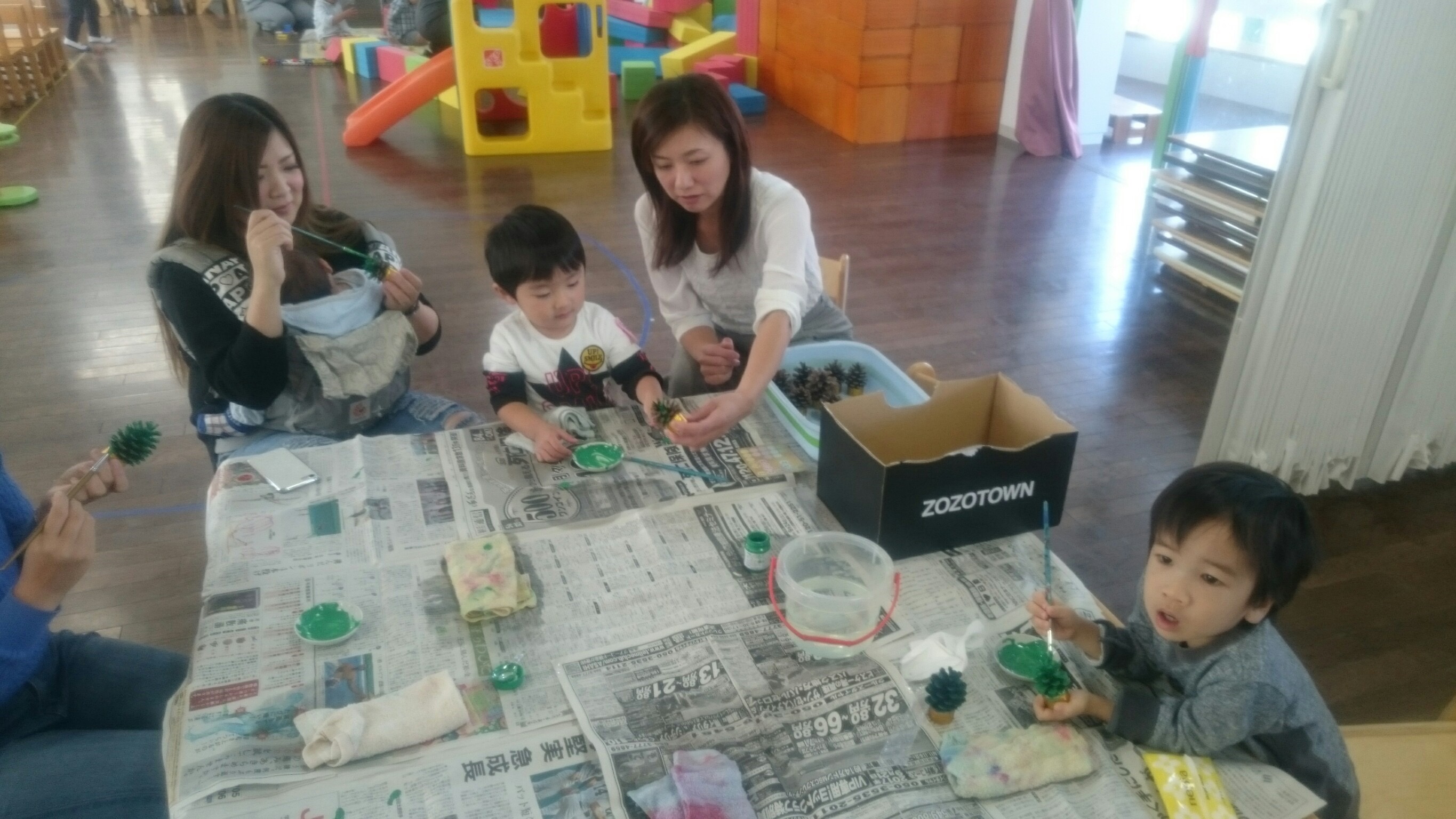 まつぼっくりクリスマスツリー製作の第1回目は、アクリル絵の具で色塗りです。気がつくと、お母さま方だけ残って、最後の仕上げをして下さっていました。みんなの見えないところでも、頑張っているお母さまに感謝です。ありがとうございます。
