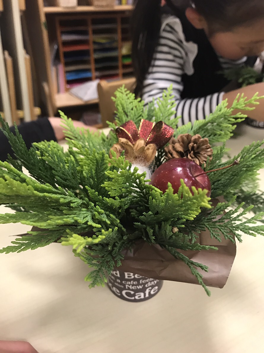 お誕生会のあとはクラスで楽しい時間を過ごしました。さくらぐみではお母様方が用意してくださった、クリスマスのアレンジメントを作りました。とても素敵なものができました。
