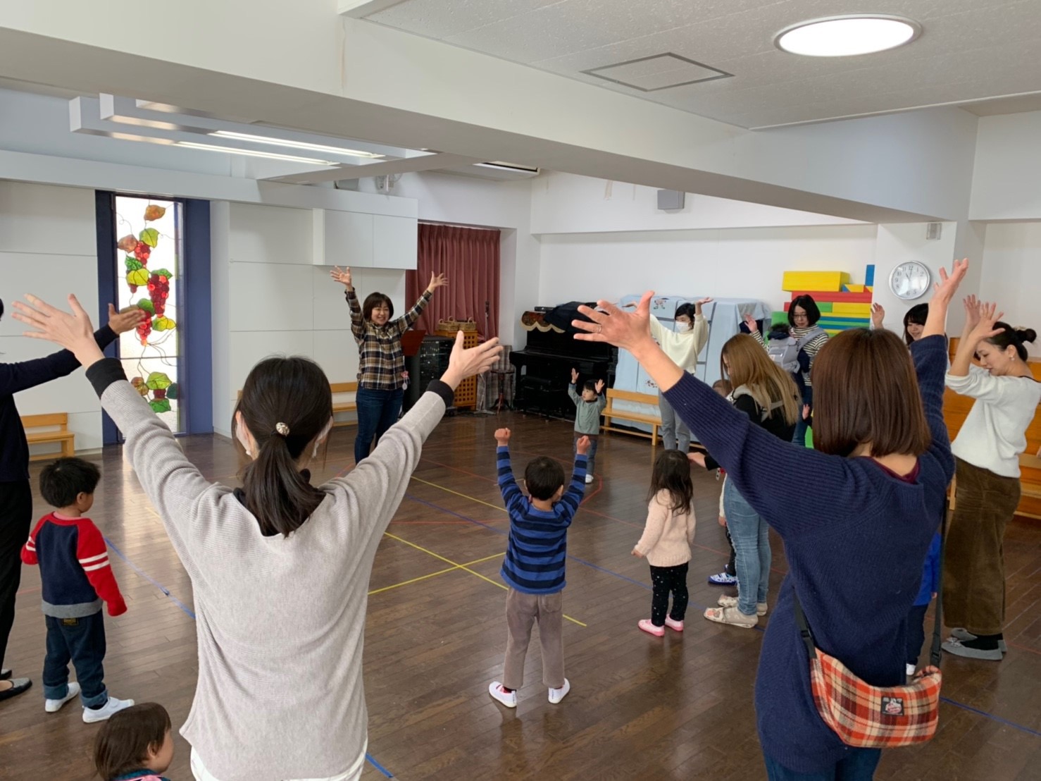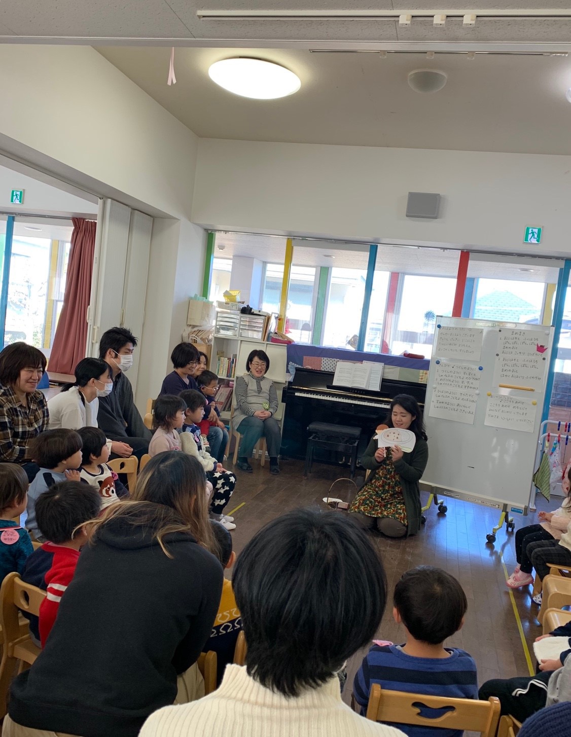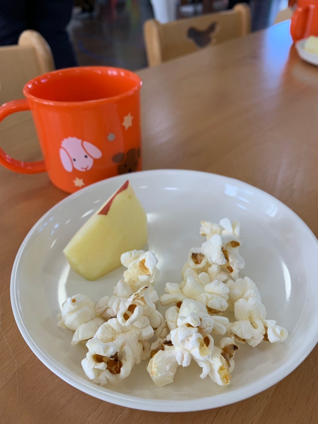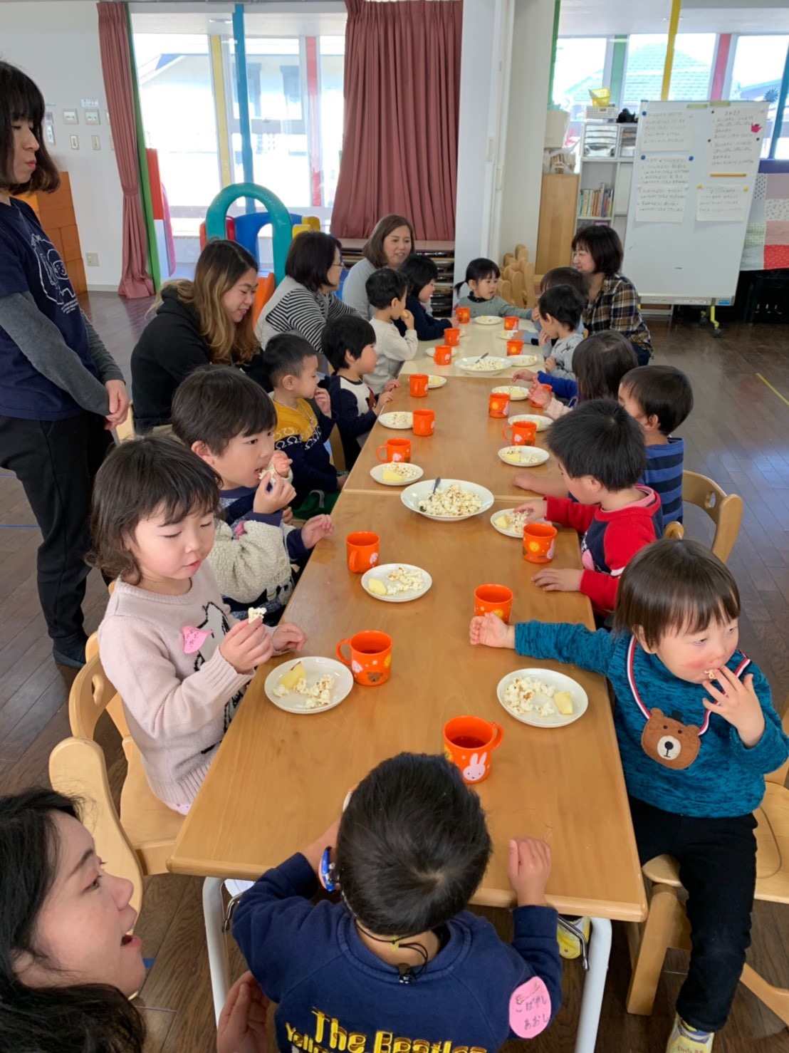 リトミックで素敵な音色の違いを感じながら歩き、さんぽの体操をして、かけっこをして、おやつはお部屋で作ってくださっていた、ポップコーンとりんごでした。たくさんおかわりできて、美味しかったですね!「てぶくろ」の絵本の後には、さようならの時間になりました。