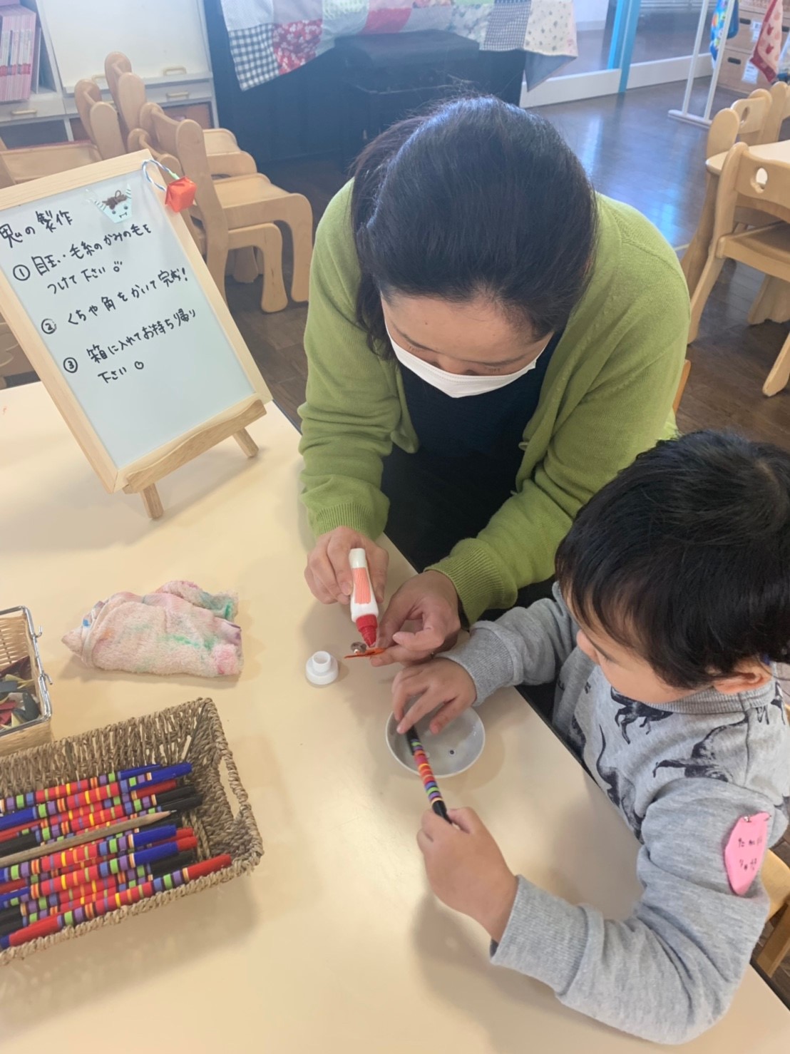 今日のもも組さんでは、節分に向け、鬼の製作をしました!もみ和紙で折った鬼に動く目と毛糸の髪の毛をつけて、お口を描いたら、完成!作った鬼を見て「こわい!」と感じたり、お豆入れの箱を持ち歩き、鬼とお部屋を散歩したり、弟の分も作ってあげたり、もも組さんの取り組む姿が可愛らしかったです!