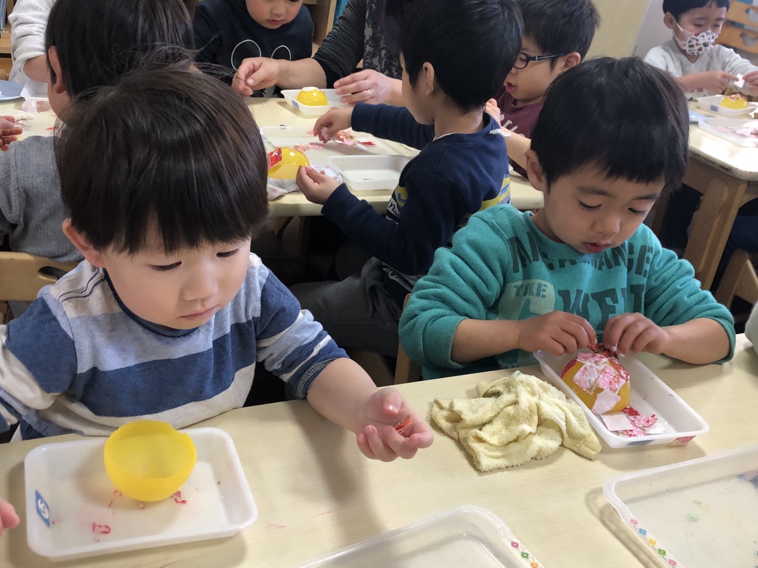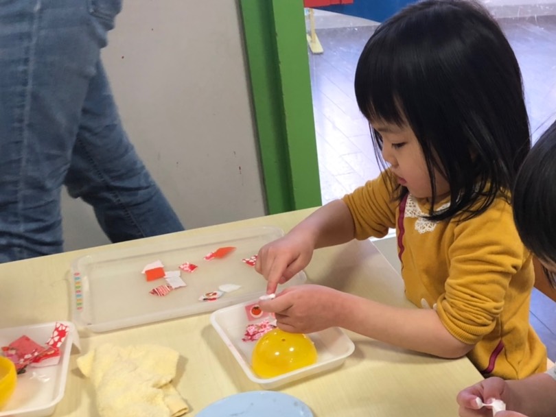 ガチャガチャのカプセルに、ちぎった千代紙を貼っていきました。