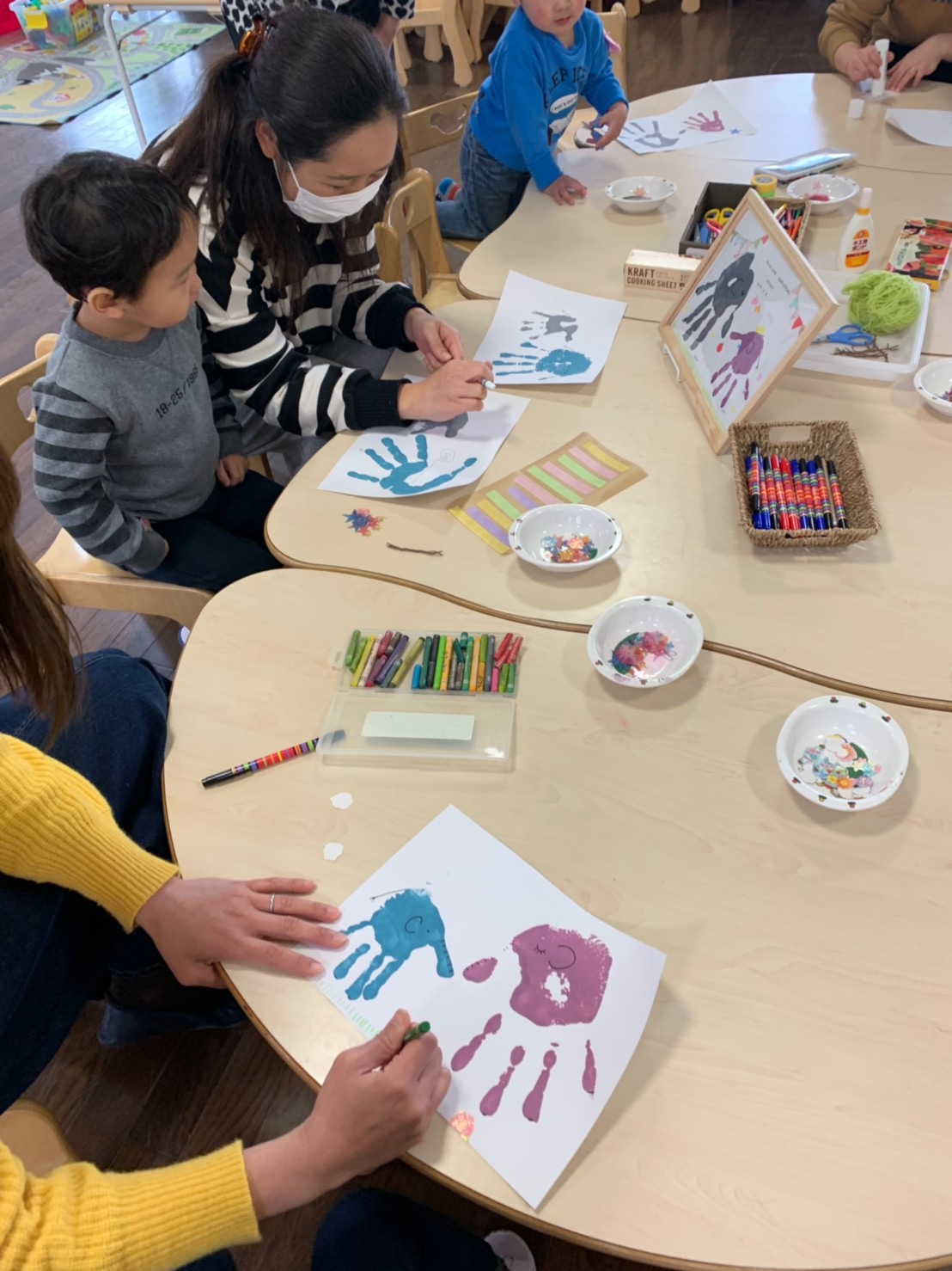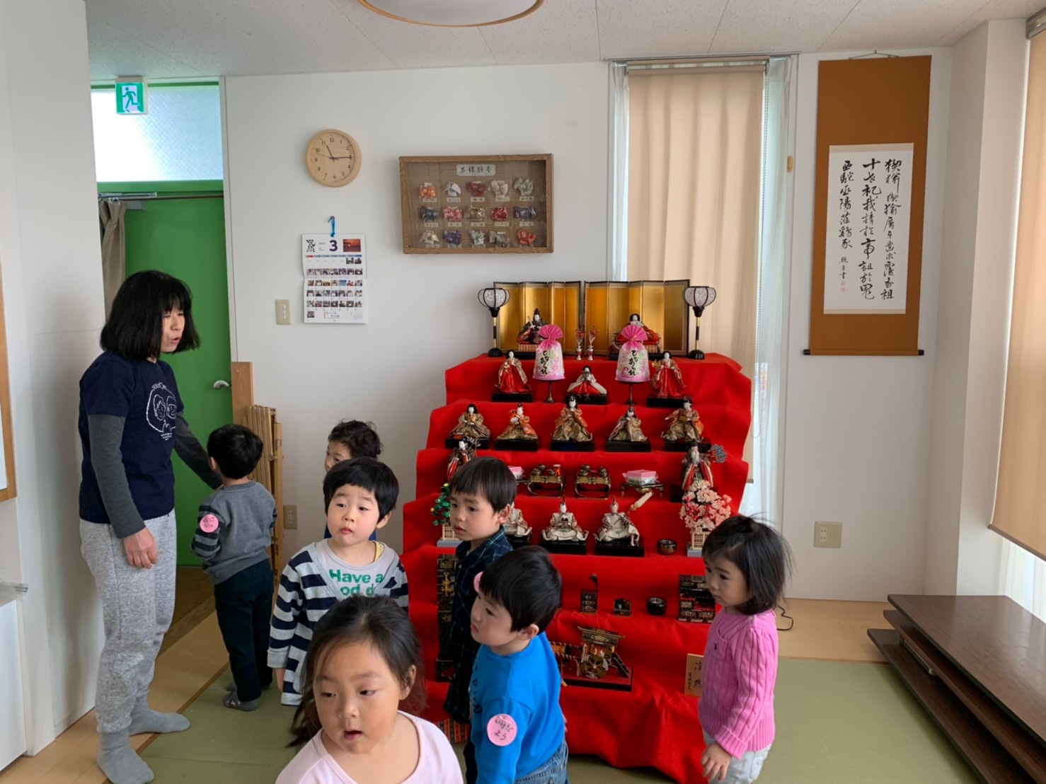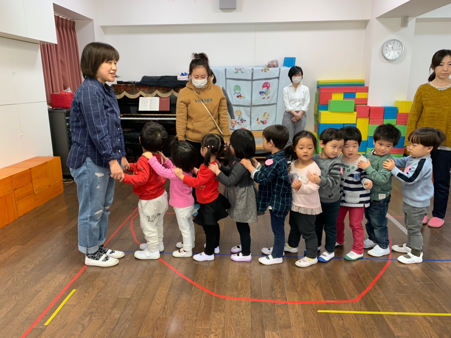 今日のもも組さんは、大型積み木のトンネル・くねくね平均台・滑り台のアスレチックコーナーで遊び、バランスをとり身体を使って遊びました!お母様方は、親子の手型スタンプに絵を描いたり、色紙をちぎったり、画用紙でお子様の好きな新幹線を貼って下さいました♪礼拝をして、2月生まれのお誕生日会をして、リトミックではカスタネットで♪うれしいひなまつりを演奏しました!そして、もも組さんはお母さんに「行ってきます!」をして、幼稚園の和室に飾っているおひなさまを見にいきました。ホールに戻って、おやつの安納芋とパイナップルを食べて、お母さんのお膝の上でさようならの会をしました。今日も、子どもたちが、ひとり一人自分を発揮して遊び、子ども同士の世界が広がっている光景を見て、嬉しく思いました。