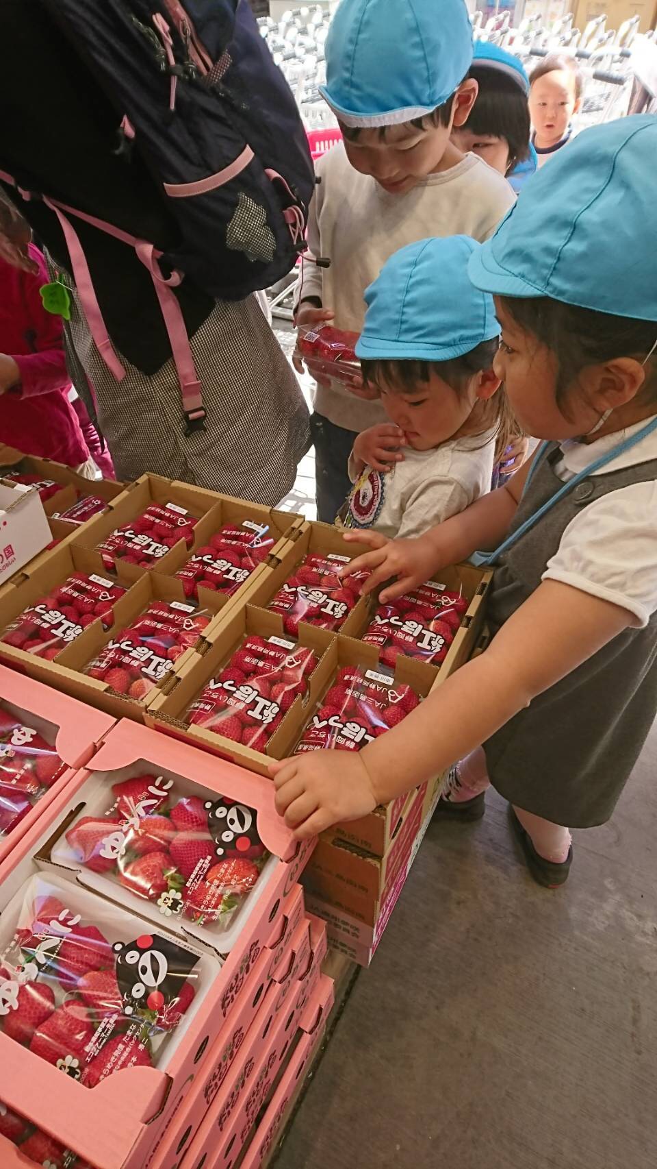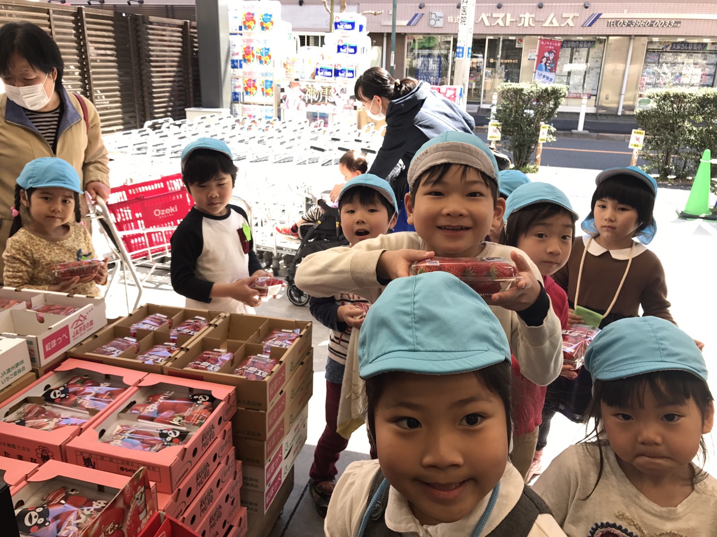 年長さくら組は、朝からお店にイチゴを買いに出かけました。自分たちでイチゴを選んで、お財布からお金を出してお支払い。上手にお買い物が出来ました。