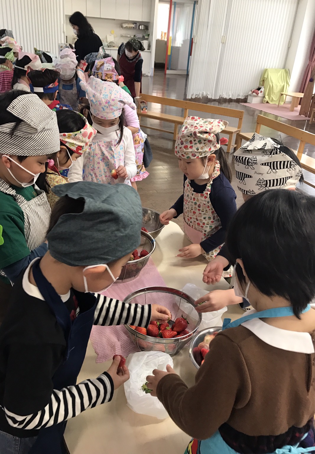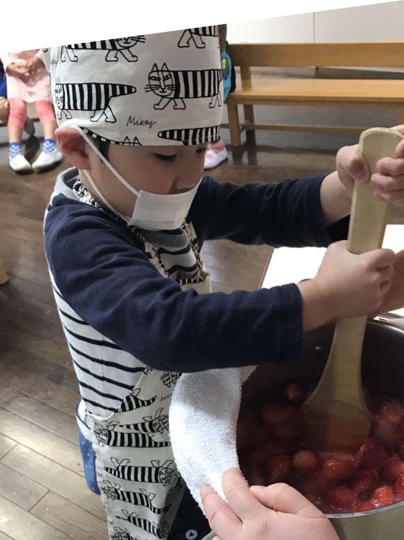 幼稚園に戻って、ヘタを取り、ジャム作り。お鍋にお砂糖とイチゴを入れて火にかけ、混ぜて、混ぜて。。。