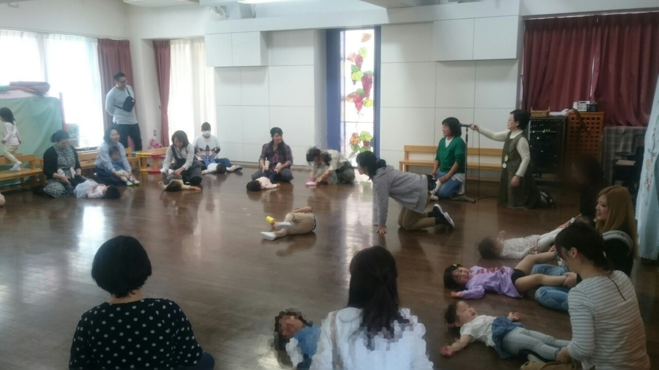 リトミックでは♪チューリップの歌を歌い、きれいなピアノの音を聴きながら、リズムに合わせて歩きました。親子触れ合い遊びをして、大好きなお母さんのお膝の上で紙芝居の時間を過ごしました。おやつは、2色のゼリーとバナナでした。