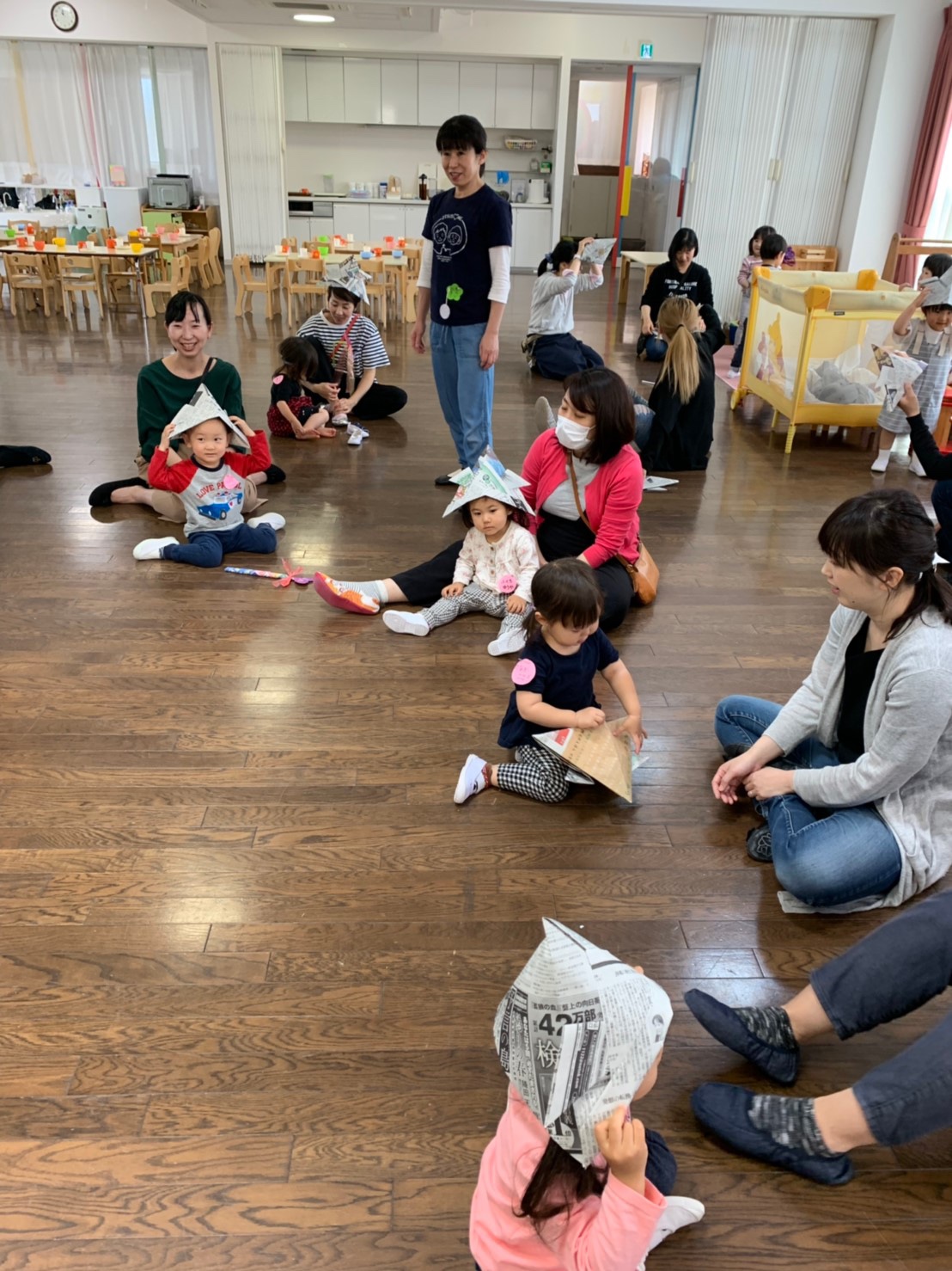 紙芝居を見てひと休みした後は新聞紙で遊びました。