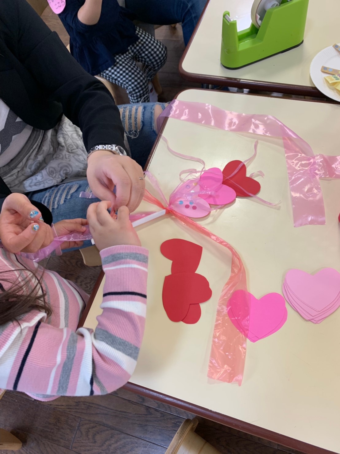ハートやリボン、スズランテープもたくさんヒラヒラさせて、素敵なステッキが出来上がりました。