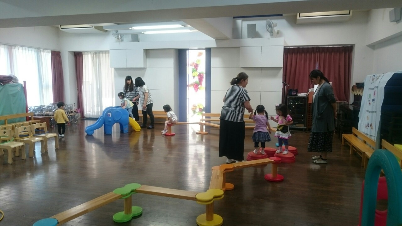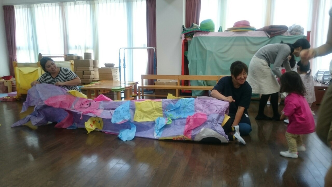 今日は、ホールにアスレチックコーナーを設けて、くねくね平均台を渡ったり、フラフープトンネルをくぐったりして遊びました。みんなでダンスを踊るために、お母さんと一緒にポンポン作りをしました♪お片づけの後には、大きなこいのぼりの中に入って、長いトンネルの中を冒険しました!