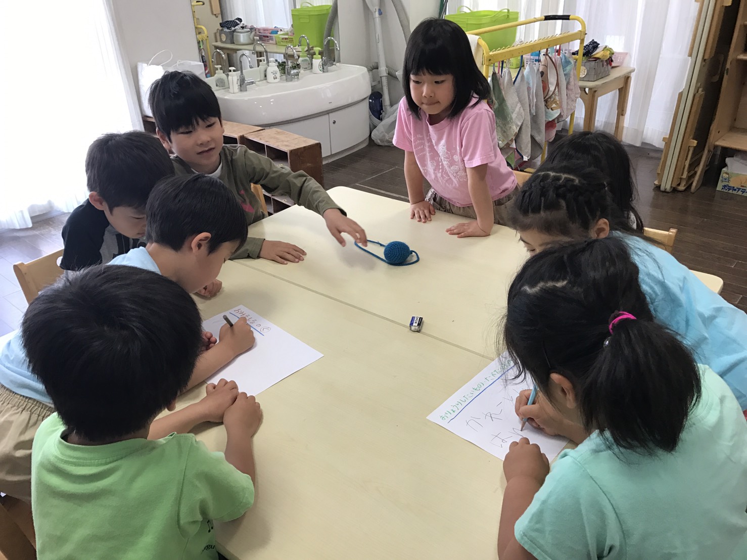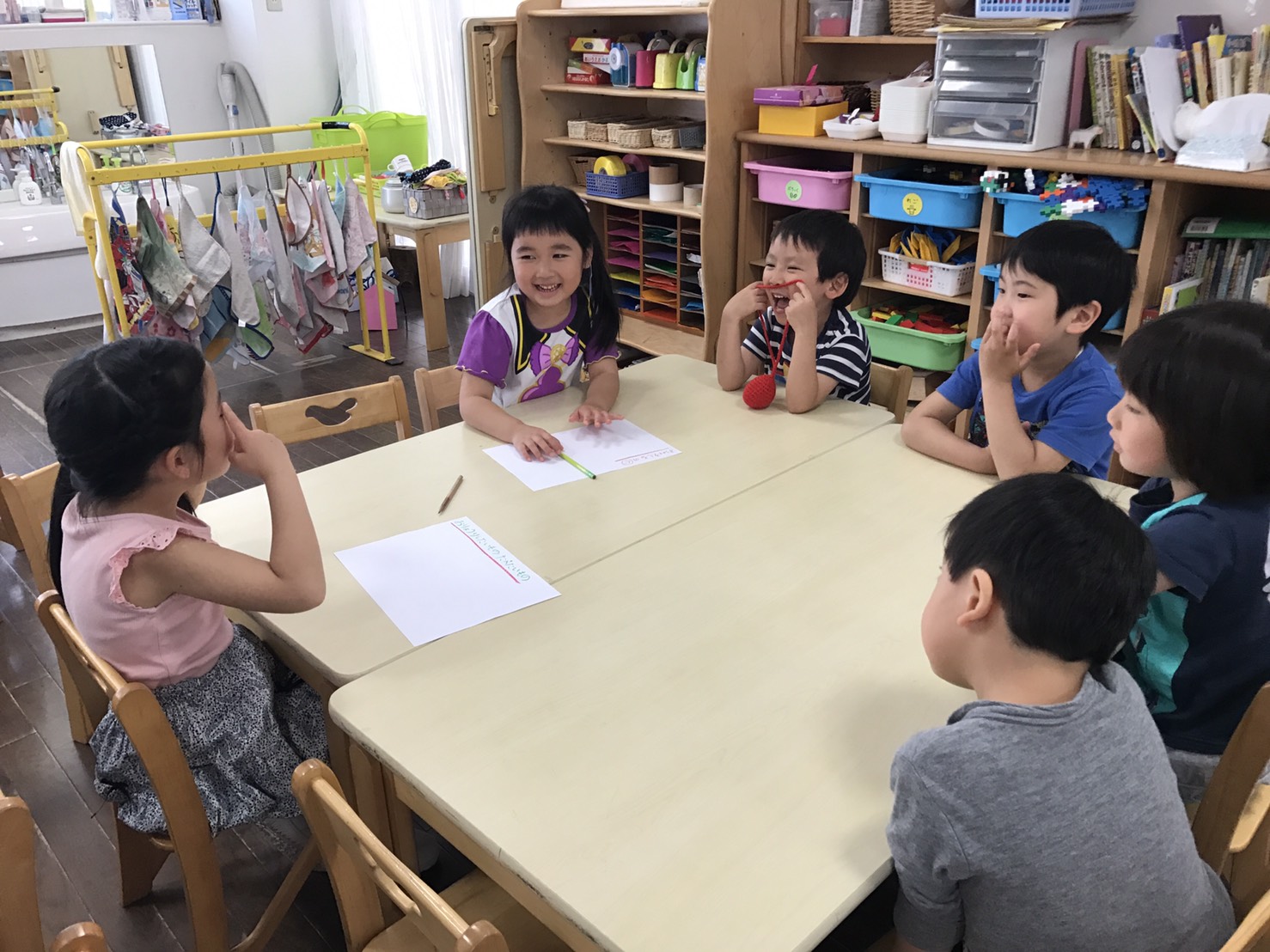 グループに分かれて、話し合いの時間を持ちました。テーマは「お味噌汁に入れたいもの」、「幼稚園でお料理したいもの」。みんなで楽しそうに話し合っていました。これからクッキングの時の参考にしたいと思います!