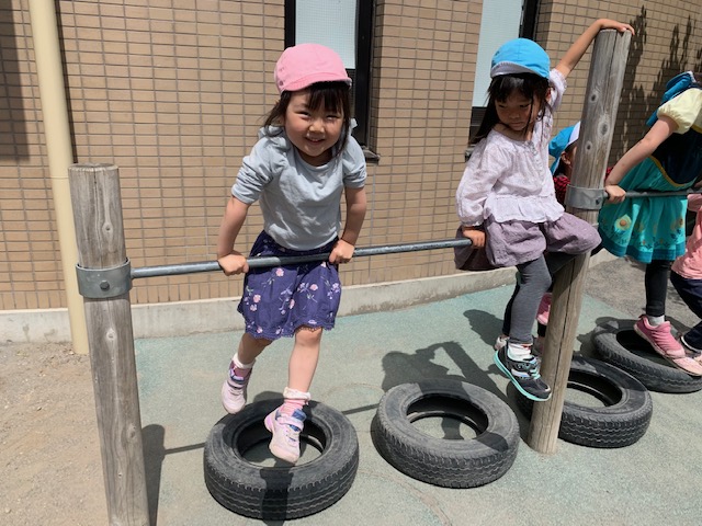 園庭で… 今日のひとこま 2019.05.15 朝から天気が良かったので園庭で遊びました。砂遊びしたり、鉄棒したり、さくらさんのお寿司屋さんに行ったり、、、 体操もみんなでしました。だんだん覚えてきているゆりさん、頑張って踊っている姿がとても可愛いですね。