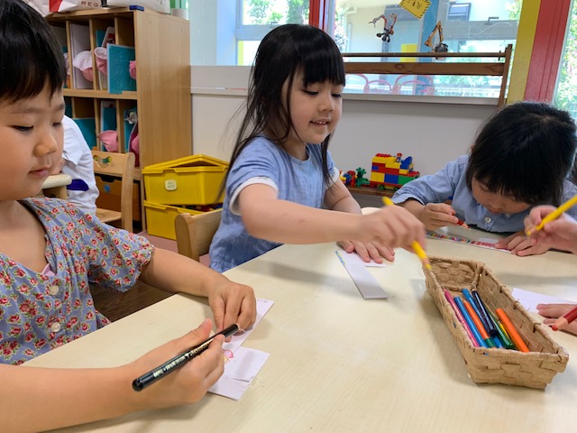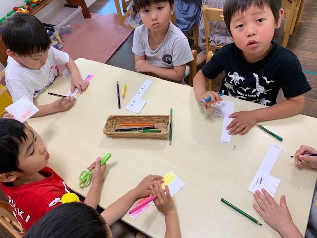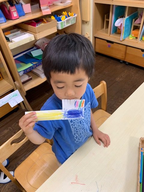 来月6月には歯と口の健康週間『虫歯予防デー』があります。ハサミと色鉛筆を使って歯ブラシを作りました。お話したり、ご飯を食べたり、、、これからも歯を大切にしましょうね。