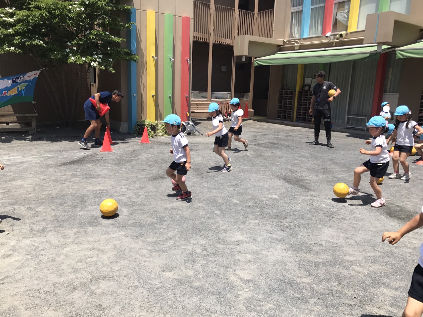 今日はサッカー教室がありました。年長さくら組は、暑い中でしたが、初めてのサッカー教室を体験し、とても楽しく過ごしました。
