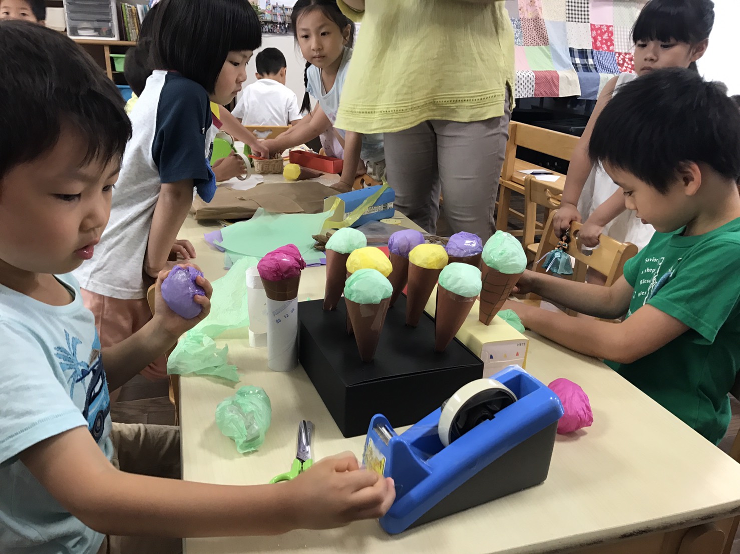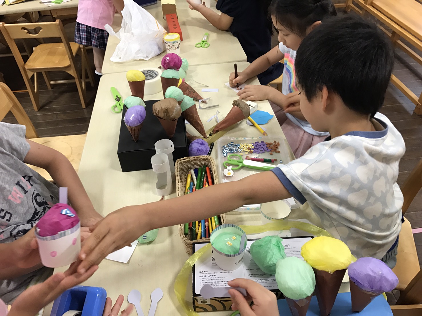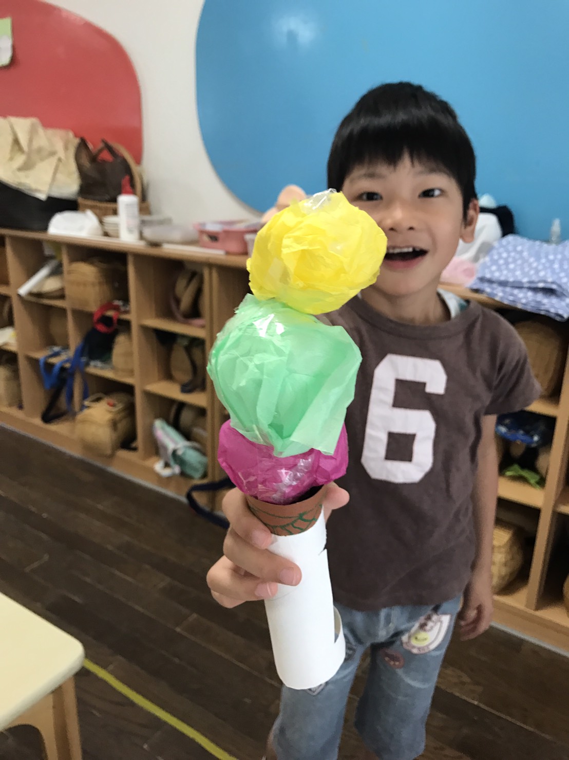 年長さくら組では、お店やさんごっこの後、アイスクリーム屋さんを開店しました。「いちご味だよ!」「ブルーベリー味です!」「これはミントだよ。」色々な味があってとても美味しそう。幼稚園内を回り、お客さんに売って、楽しんでいました。また続きをしましょうね。