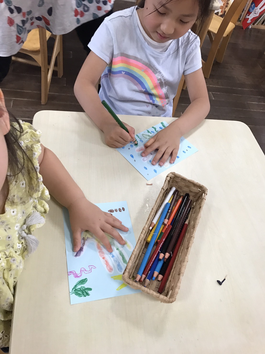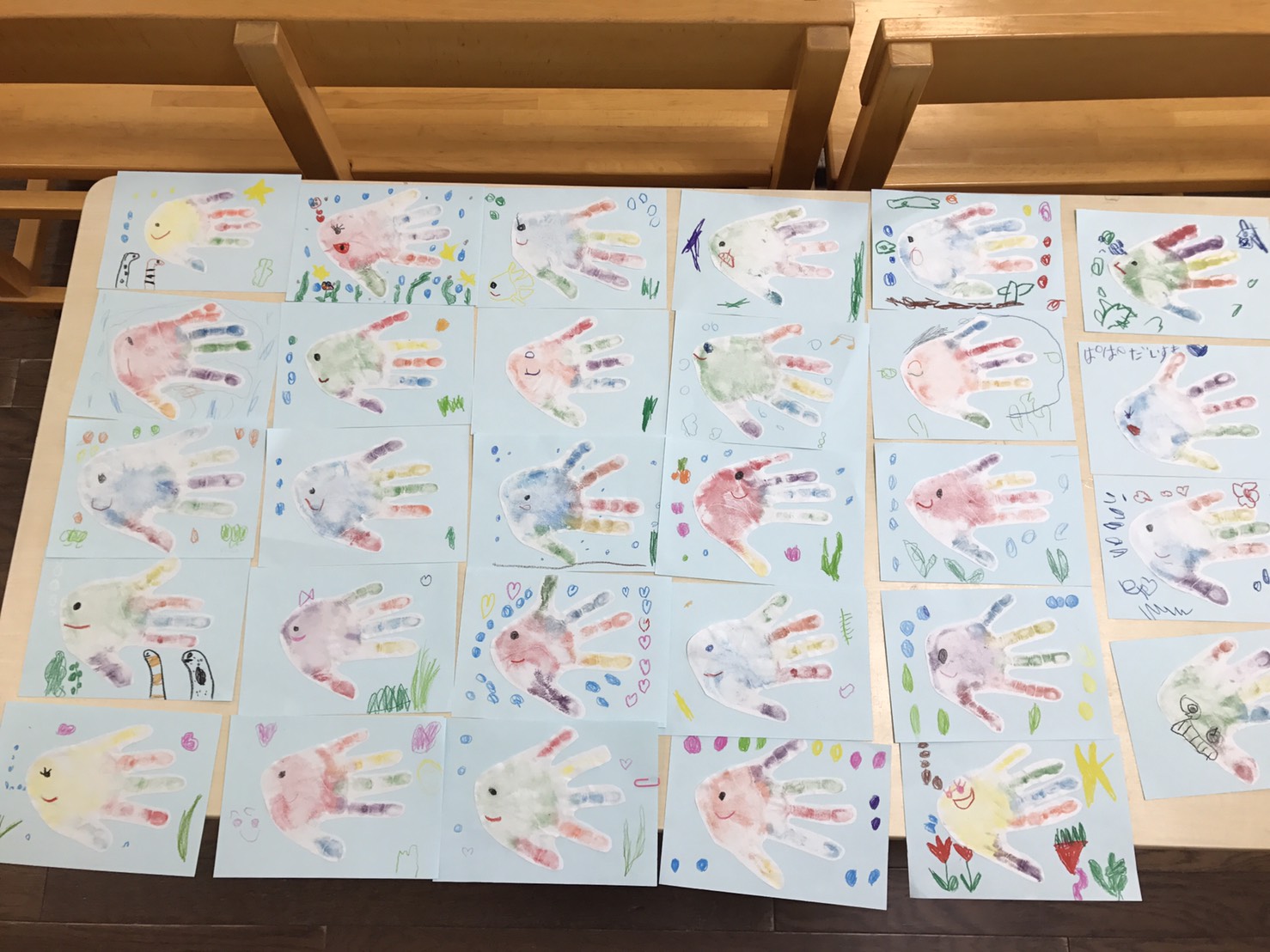 フレームを飾り、手型アートをして、父の日のプレゼントを作っています。小さな手で、細かい作業を頑張りました。おうちの人に喜んでもらえますように。。。