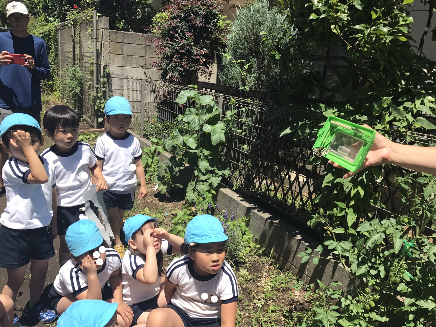 ミカンの木の葉っぱを取って来て、あおむしになった幼虫にあげたり。。。アゲハ蝶の育て方の本をみんなで読んだり。「はらぺこあおむし」の本を読んだり。