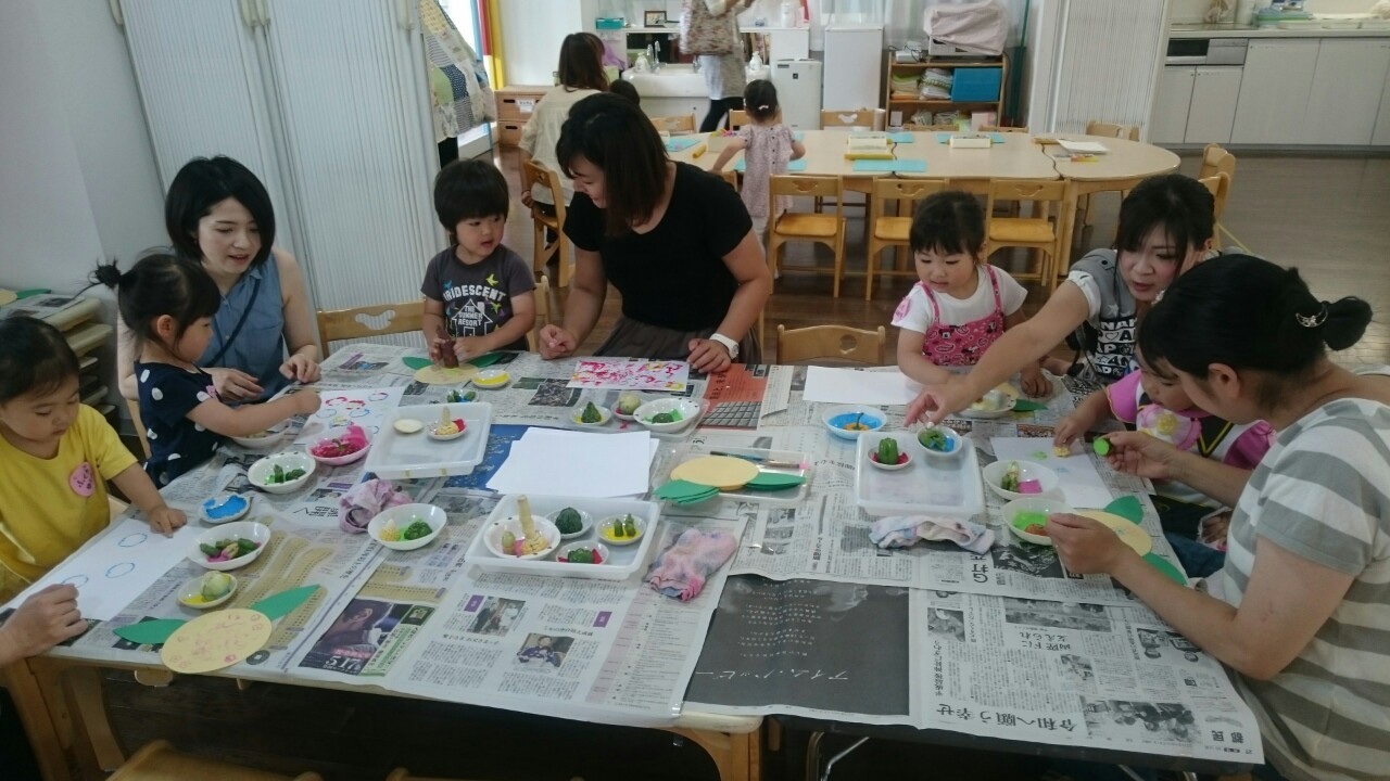 今日のもも組さんは、野菜スタンプをしました!並んだ野菜は、ゴーヤ・ピーマン・パプリカ・チンゲンサイ・オクラ・たまねぎ・にんじん・きゅうり・とうもろこし・さつまいも、どの野菜もひとつ一つ違って、どれも素敵な模様でしたね♪