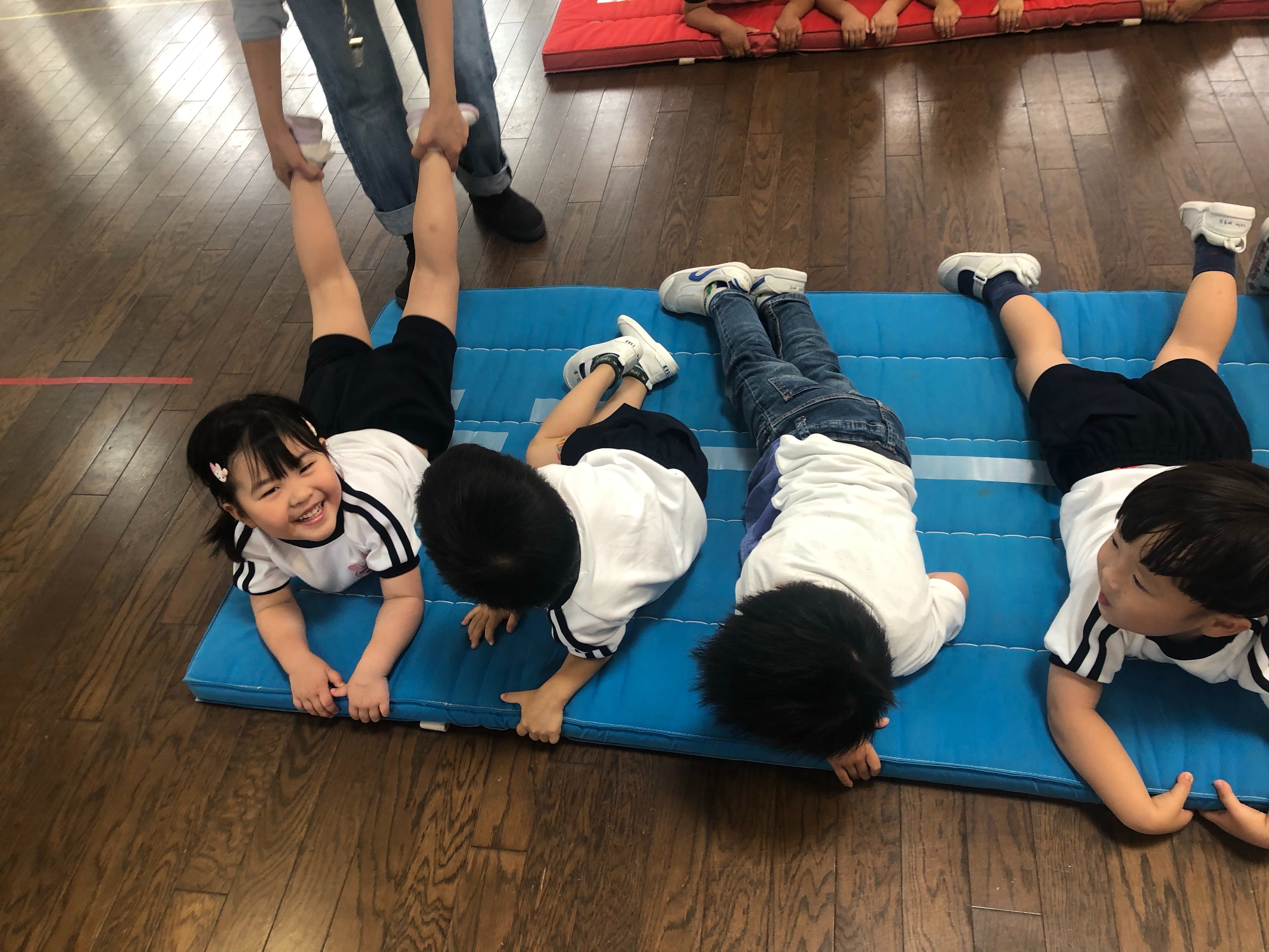 カエルさんになって跳んでみたり、ラッコさんになって足の力だけで進んでみたり、