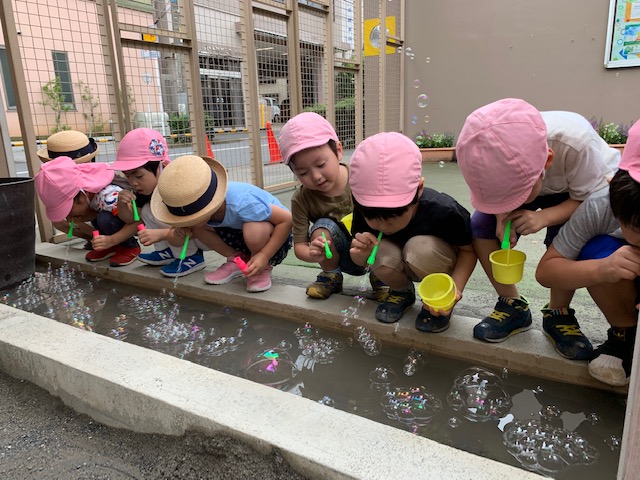 「ゆっくりふくと大きいシャボン玉ができて、はやく強くふくと小さいのがいっぱいできるんだよ〜」
