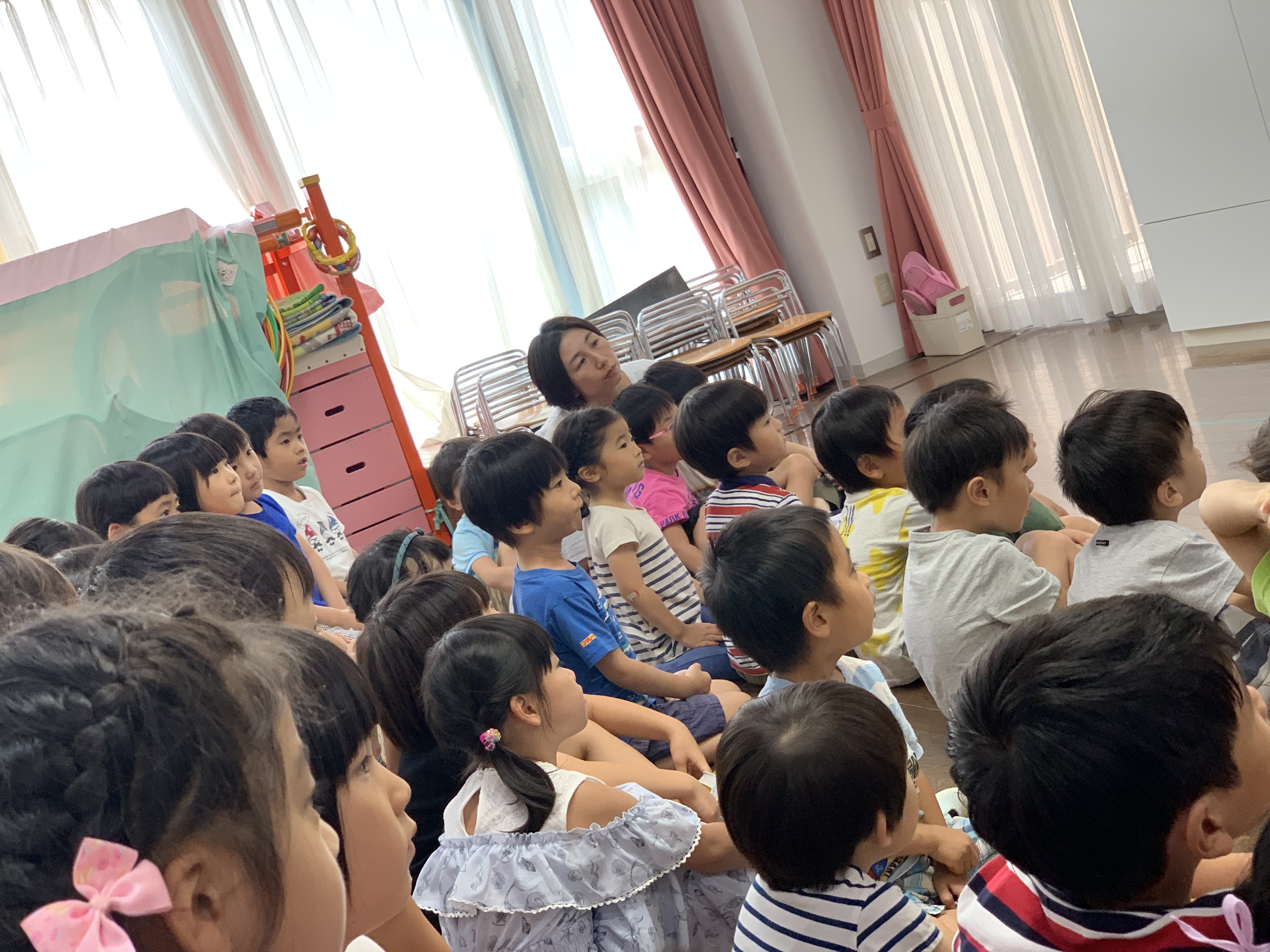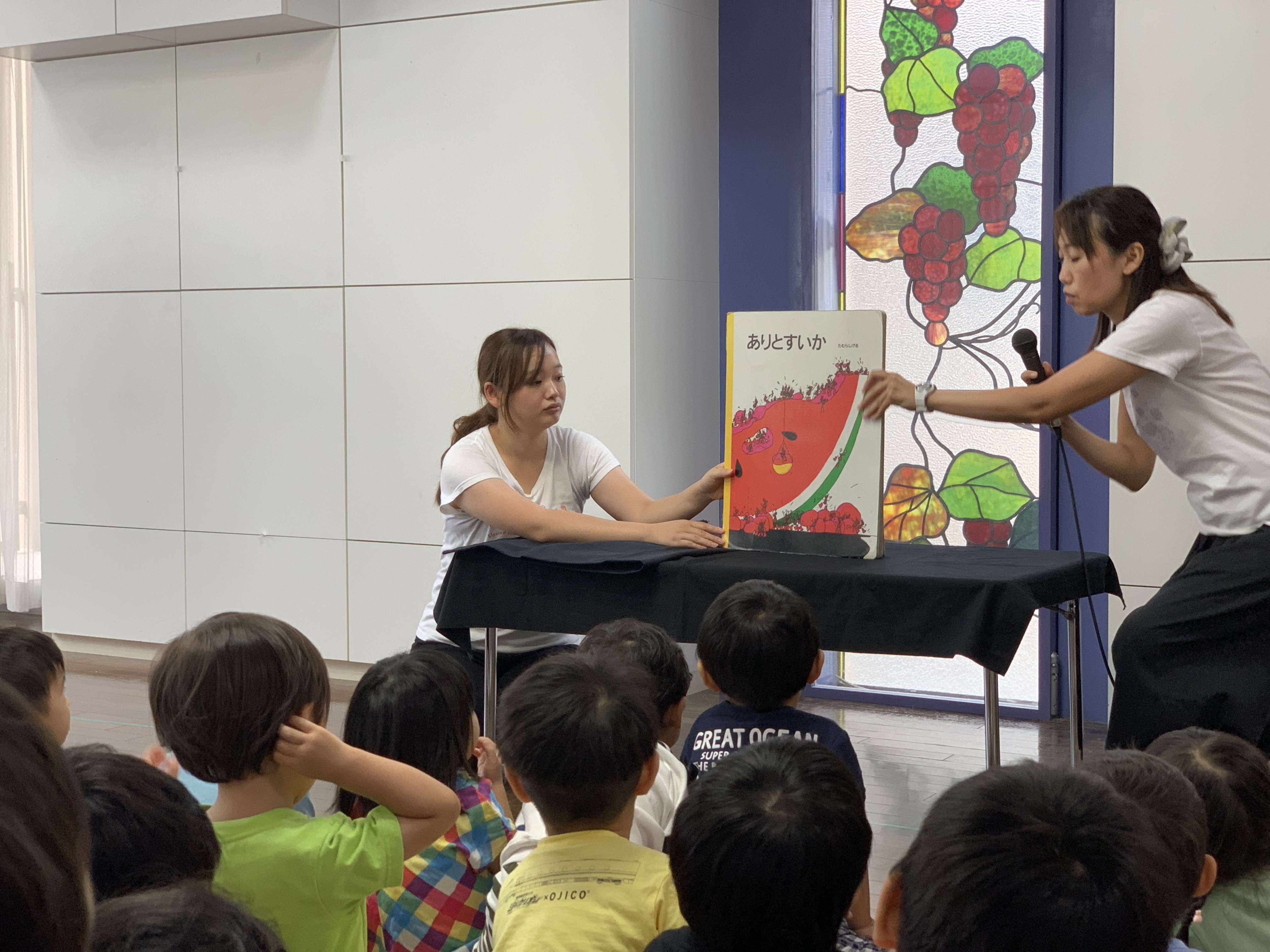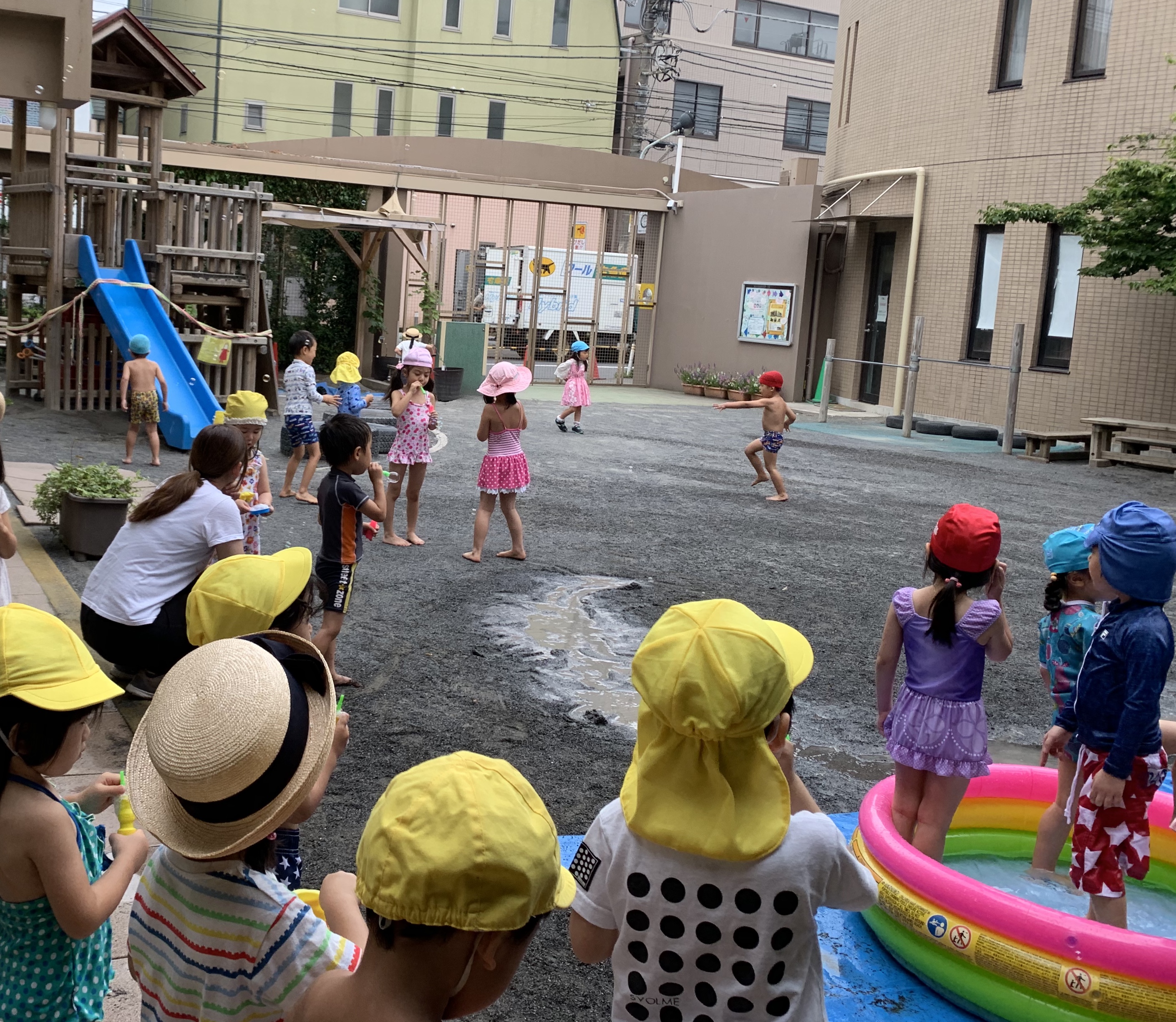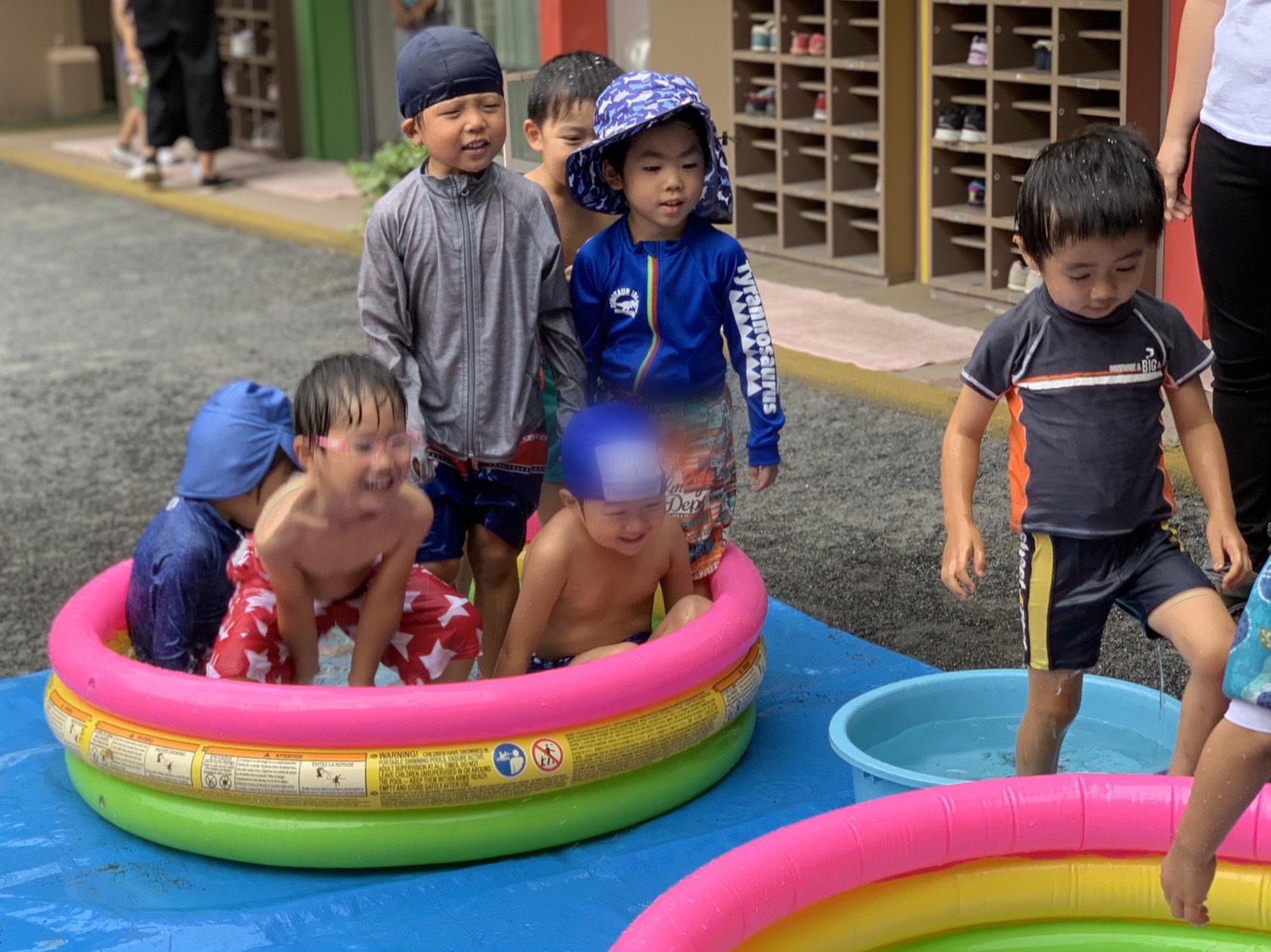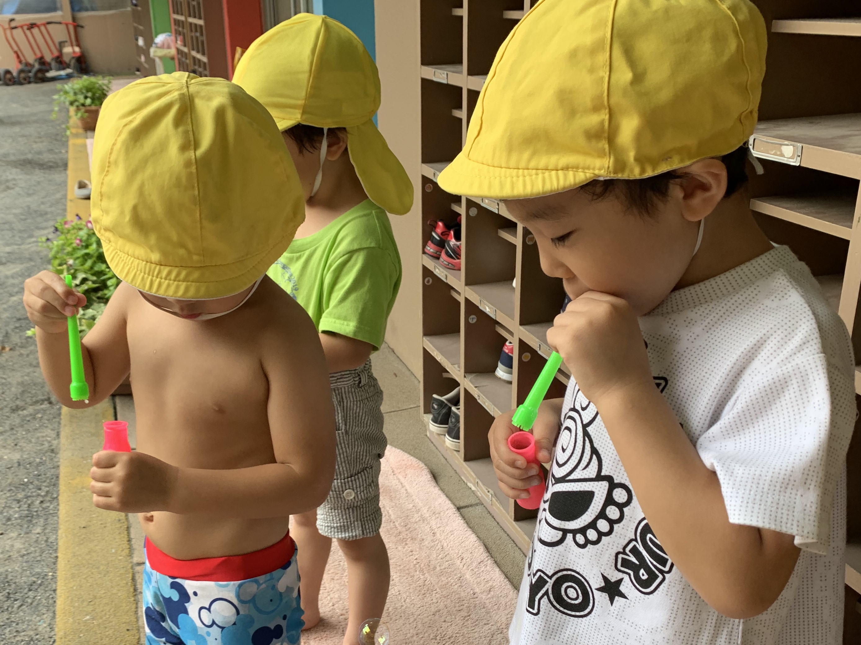水着に着替えて水遊びをしたり、シャボン玉をして遊んだり…礼拝をして、アイスを食べたり