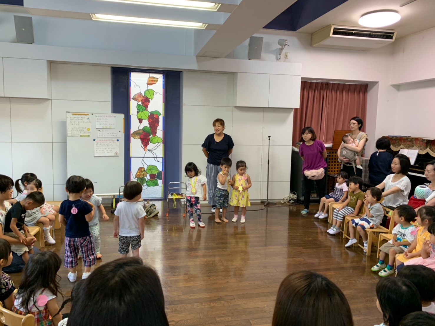 お片付けの後は、どうぶつ体操をして、朝の会でとんぼのめがねのパネルシアターを見て、歌いました♪お礼拝では、聖句「わたしはぶどうの木、あなたがたはその枝である」ヨハネ15:5のお話しをしました。イエス様とつながって、あたたかい栄養をたくさんもらって、成長できますように。