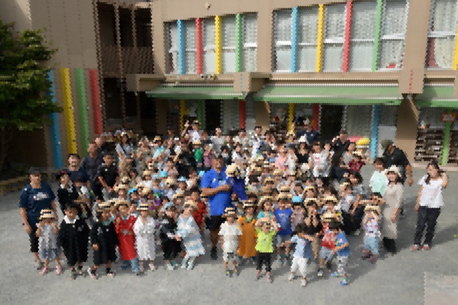 月曜日のラグビー体験会の熱がまだ冷めない子どもたち。今日も元気に登園しました。門では、ニュージーランドのラグビーサポーターチームとティモさんのサインが入ったラグビーボールを園長先生が子どもたち一人ひとりに触らせてくれました。