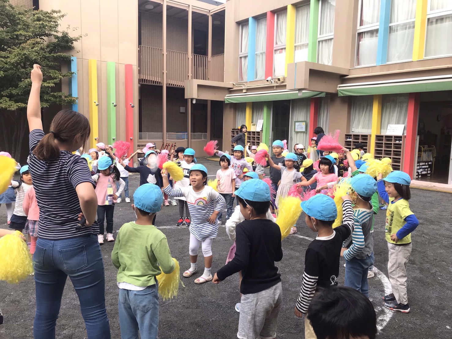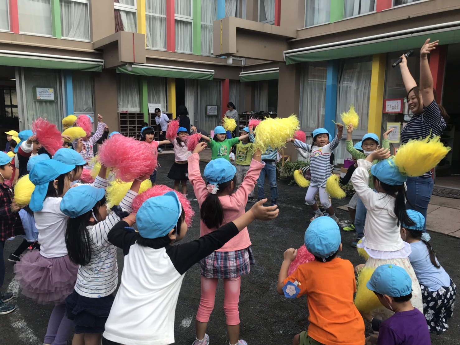 他のクラスのダンスは、練習の時からよく見ていて、一緒に踊っていました。今日はポンポンや布を借りて、いっそう楽しく踊ることが出来たようです!