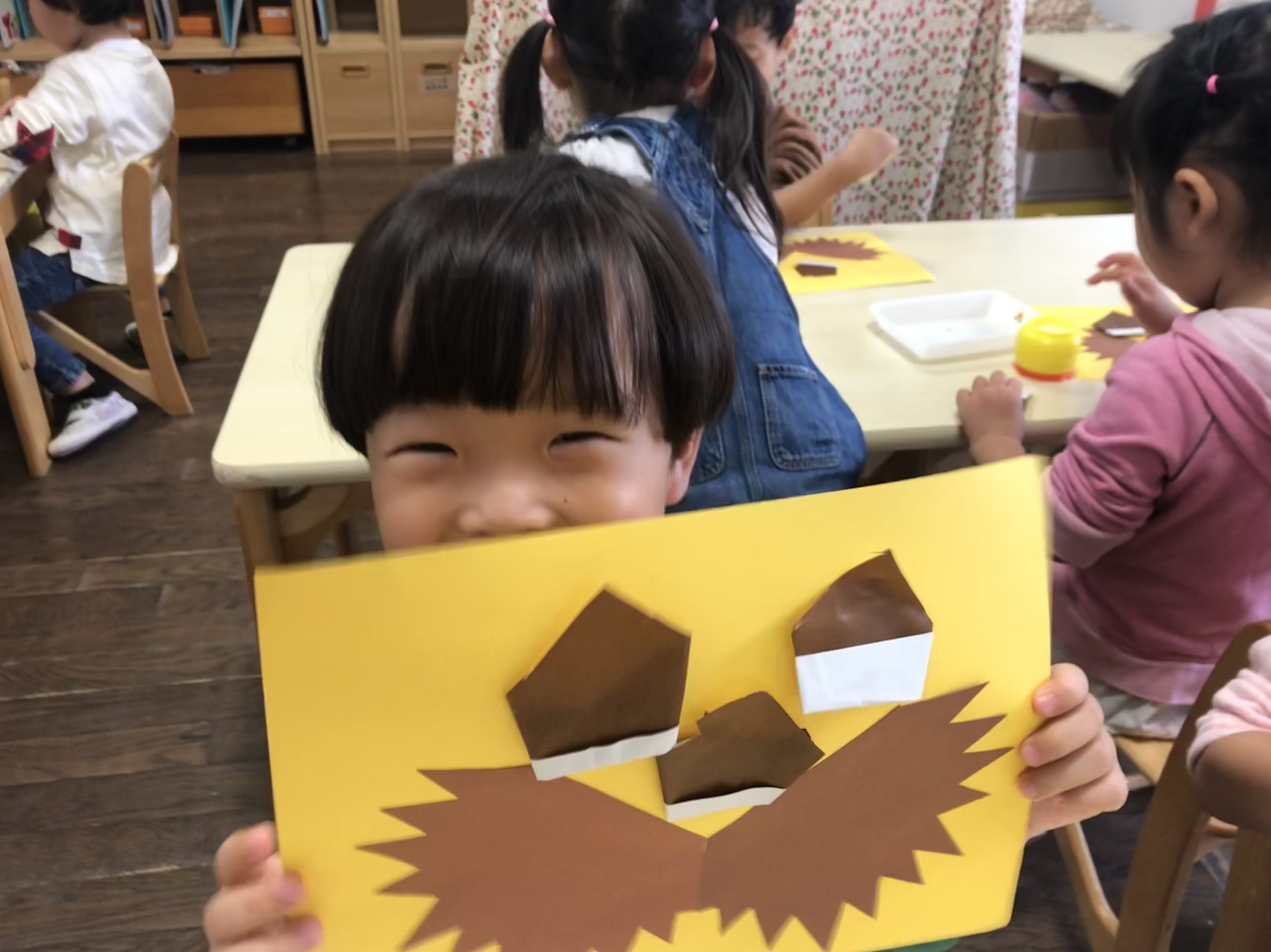 ゆり組では、折り紙を折って作った栗をのりで貼りました。