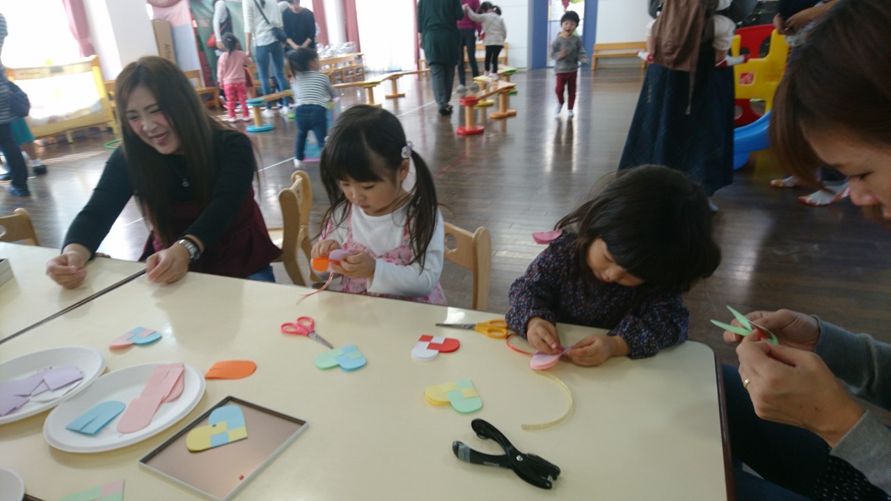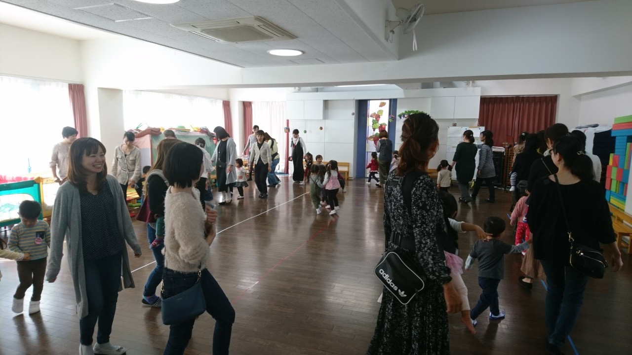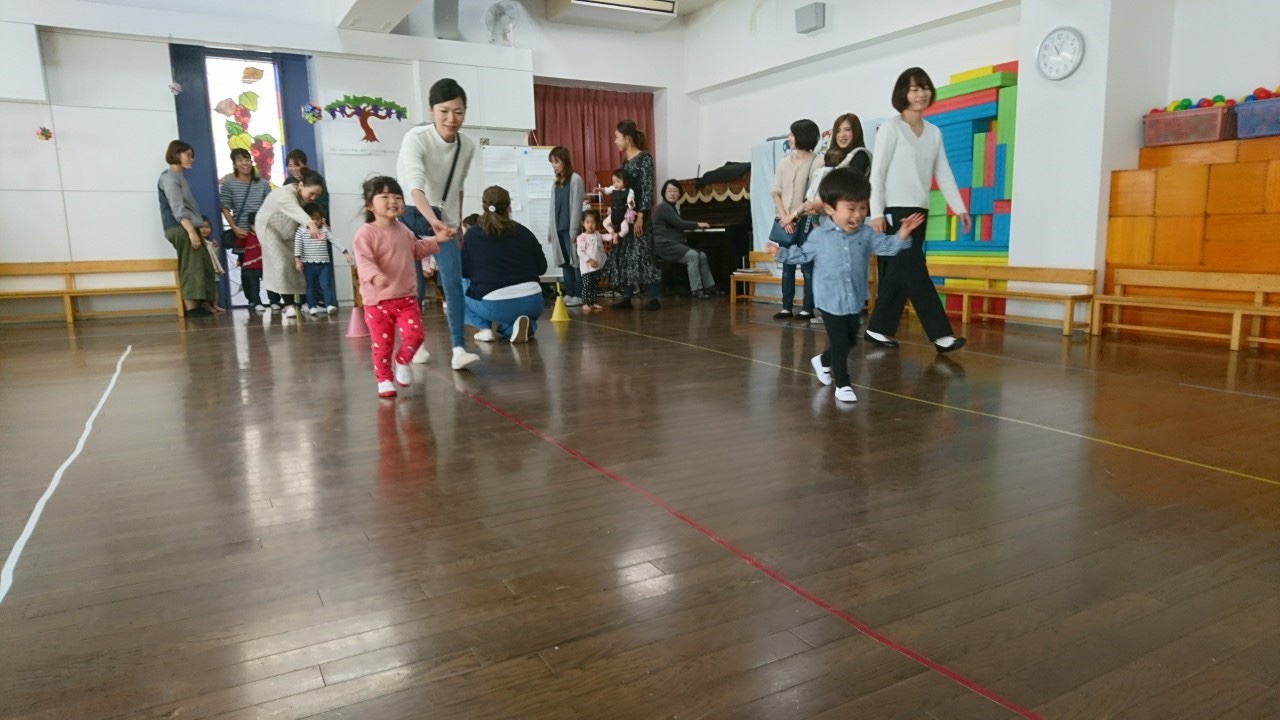 リトミックでは、ともだちっちっち!と歌に合わせてお友達と手をつないで曲のテンポを聞きながら歩くことができました。