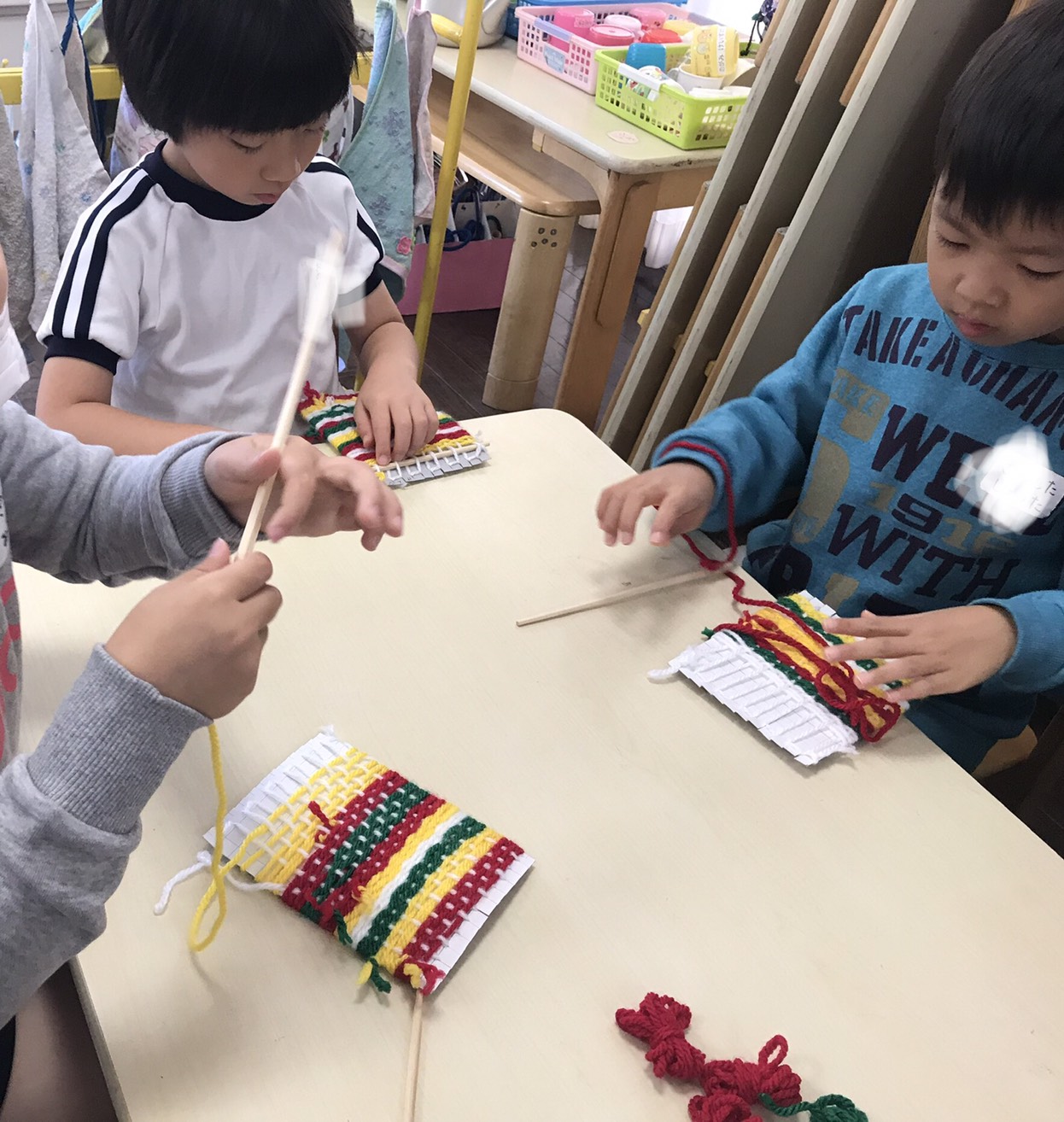 さくら組では、クリスマス献金を入れるための、献金袋をクリスマスカラーの毛糸で編んでいます。