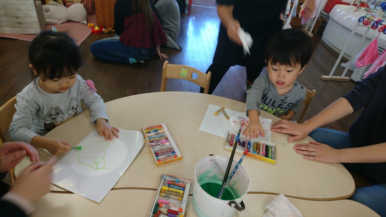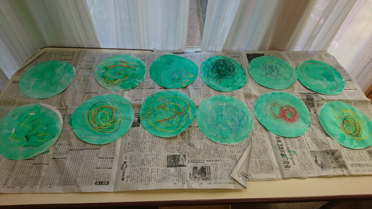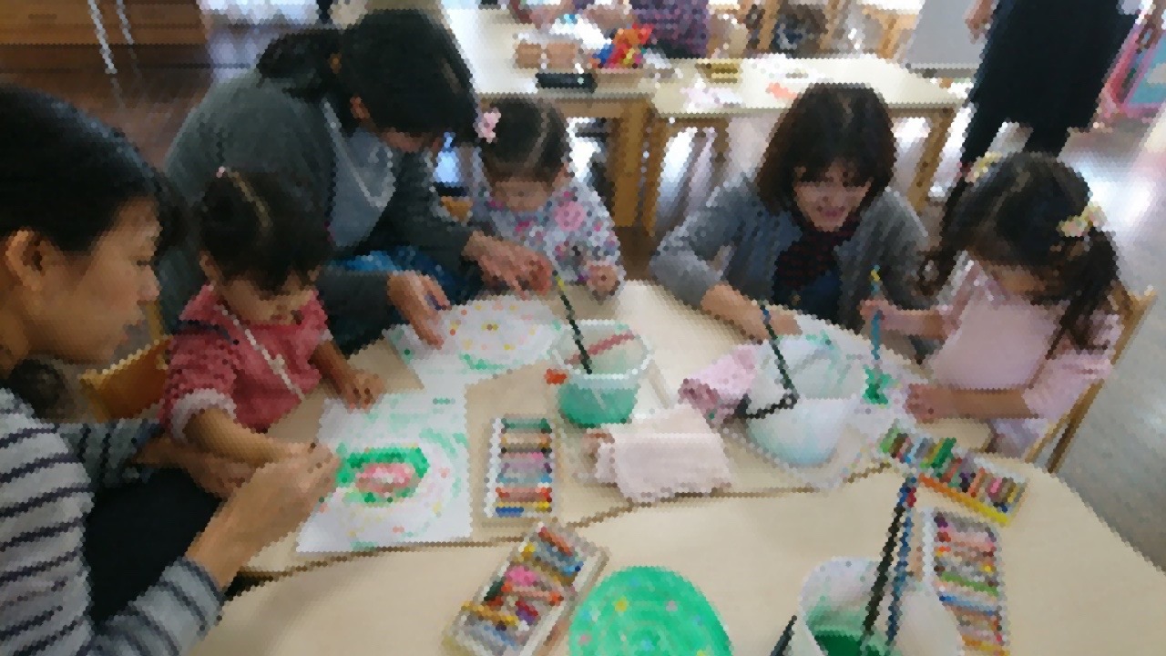 今日のもも組さんは、はじき絵をしました。クレパスで線や丸を描き、筆を使って絵の具で色を塗ると、クレパスの線をはじき、描いた線が浮き上がっている様で不思議でしたね。次回は、画用紙にハサミで切り込みを入れて、のりをつけて、クリスマスツリーを作りましょう!