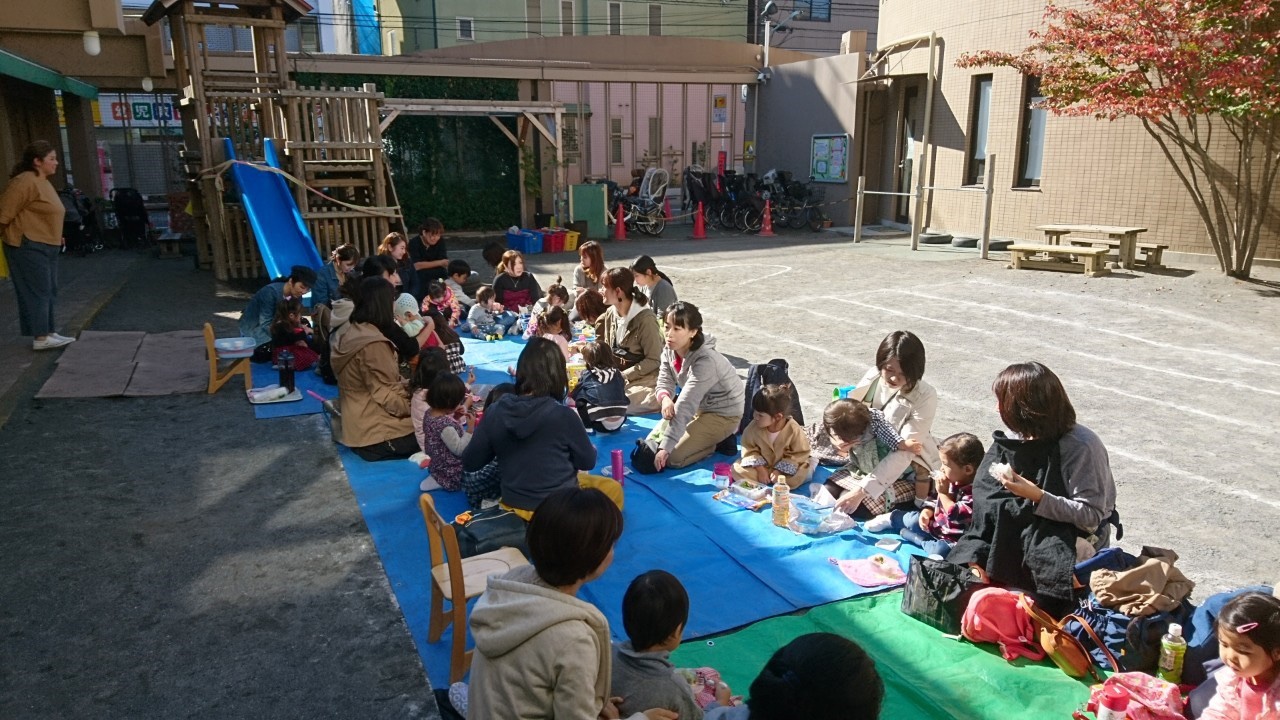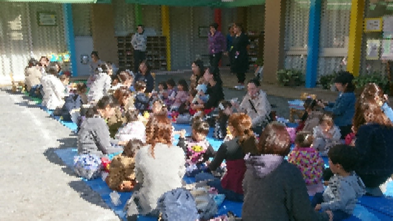 お片付けの後は、元気にきのこ体操を踊り、朝の会をしました。お礼拝では、絵本『はじめてのおべんとう』を見て、神さまにお祈りをしました。そして、楽しみにしていたプチ遠足ごっこの時間です♪ホールから園庭に移動して、大きなシートにもも組さんが集まって、一緒にお弁当を食べることができました!お母さんが苦手な野菜を、かわいく変身させてくれて、食べてみようと頑張っているお友だちもいたり、お母さん同士も楽しそうにお話に花が咲いていましたね。今日の一日に感謝します。