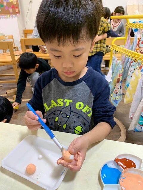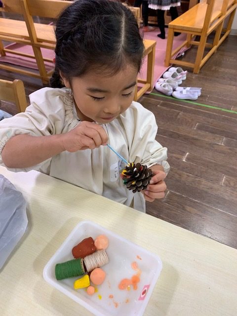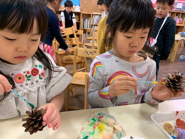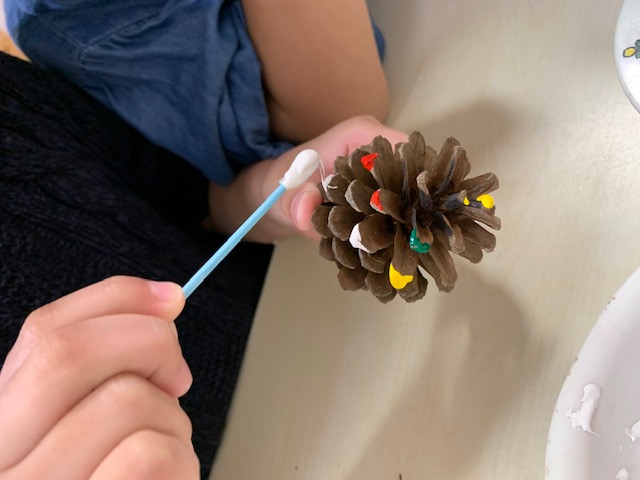 たんぽぽ組 クリスマス製作 今日のひとこま 2019.11.28 クラブ製作もそろそろ完成です。 お顔やかいばおけに色を塗って… まつぼっくりを小さなクリスマスツリーに見立てて、色をつけました。着々と出来上がっていくので、出来上がりが待ち遠しそうです。