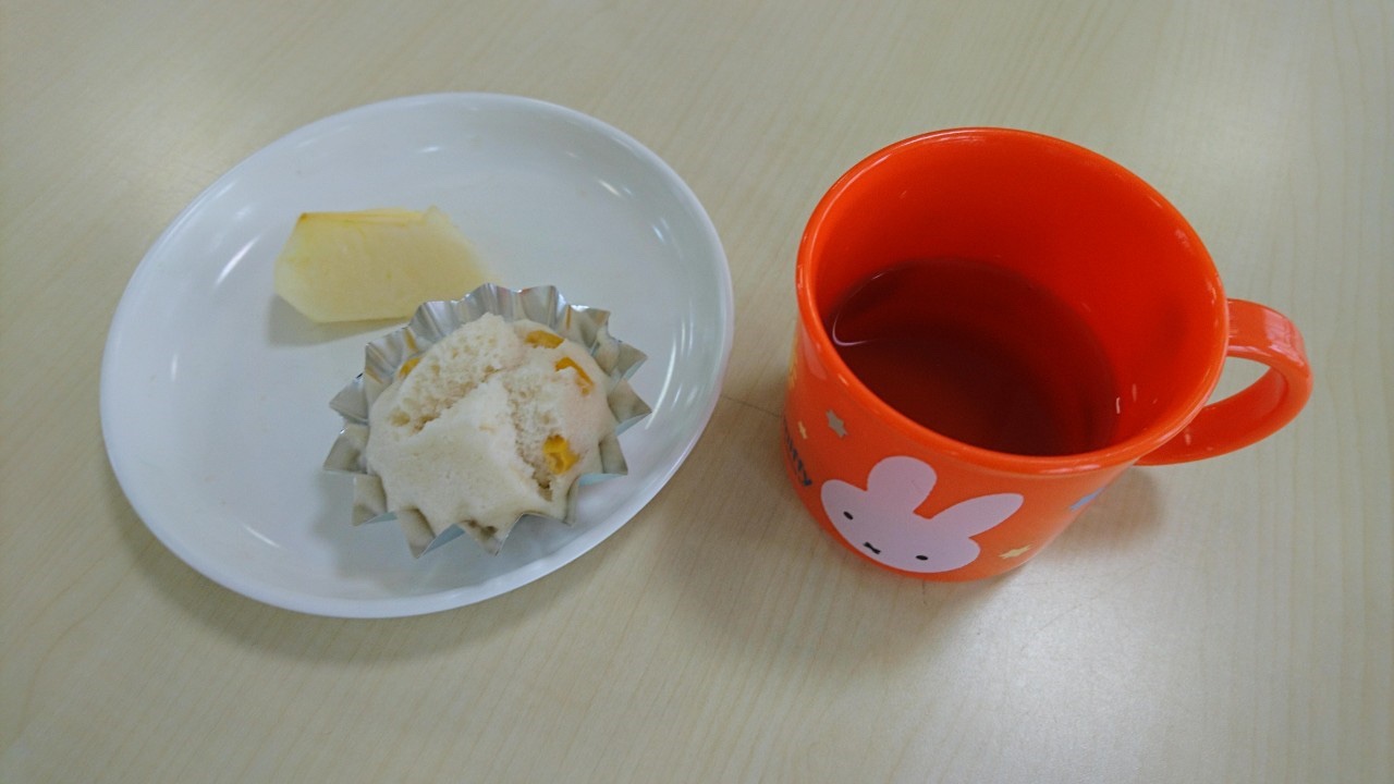 今日はコーンの蒸しパンとりんごをいただきました。