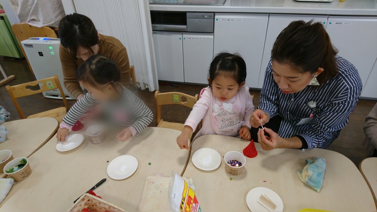 今日のもも組さんはフェルトの小さな帽子の飾り付けから始まりました。