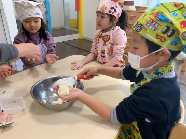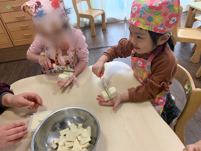 昨日はたんぽぽ組がお味噌汁を作りました。豆腐を切るのに初挑戦のお友だちが多かったのではないでしょうか、、、