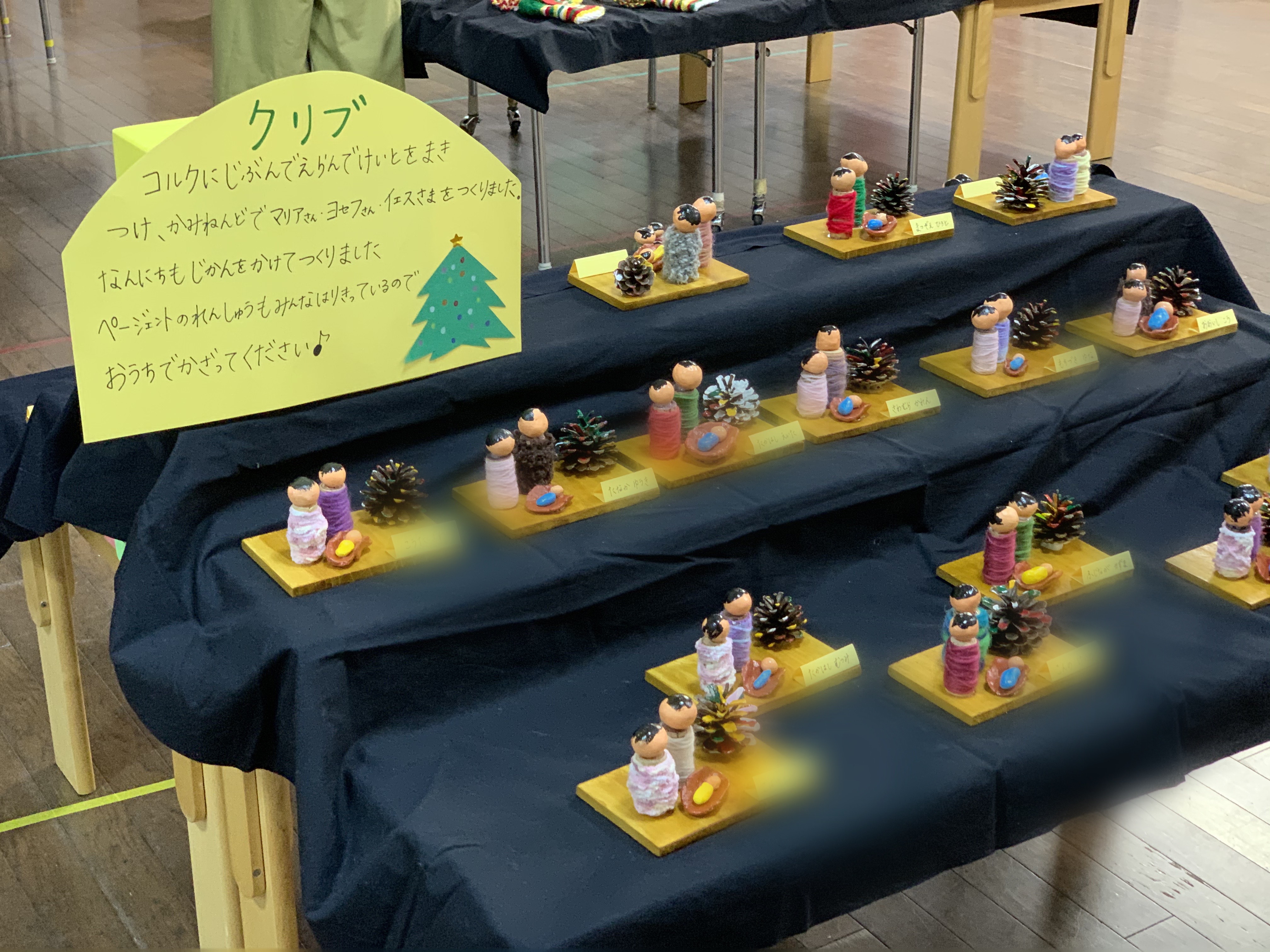 クリスマス作品展示会 お知らせ 今日のひとこま 2019.12.11 めぐみ幼稚園のホールで、クリスマスの作品展示会を行います。 小さな子どもたちの小さな手で一生懸命に作った作品です。 どうぞ、この小さな可愛い作品を見て…嬉しいクリスマスを感じてください。 保育後〜13:30 (スリッパをお持ちください) 年長組『キャンドル・スタンド』 年長組『献金袋』 年少組『クリスマス・リース』 年中組『クリブ』 年少組『献金箱』 年中組『献金袋』