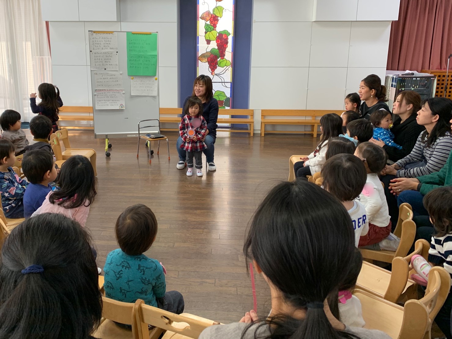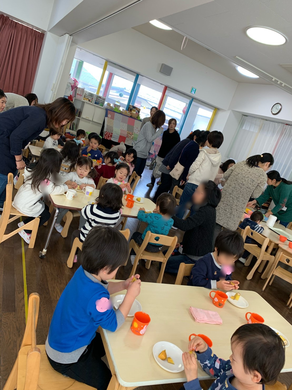 お片付けをして、お祈りをして、1月生まれのお誕生日会では♪うまれるまえからを歌い、お祝いをしました。リトミックでは♪おかあさんの歌をうたい、♪たこの歌をうたい、鈴を鳴らしました。久しぶりにかけっこをすると、悔し泣きをしたり、様々な表情が見られて成長を感じた一時でした。おやつは、蒸し芋とバナナでした、紙芝居を見て、さようならの時間になりました。