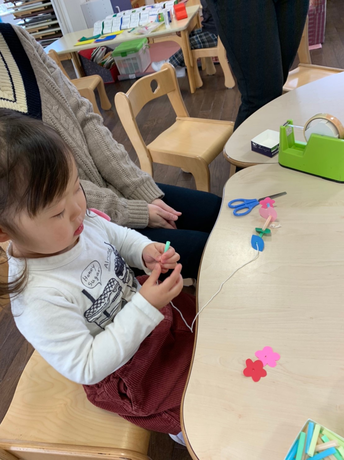今日のもも組さんは、お母様方はお子様の入園グッズ作りの相談会でした☆幼稚園の手作りの会の先輩ママから製作のアドバイスをいただきました。ももさんもバックを持って歩いてみたり、楽しみにしていましたね。また本や見本を置いておきますので、困ったら布を持って登園してくださいね。