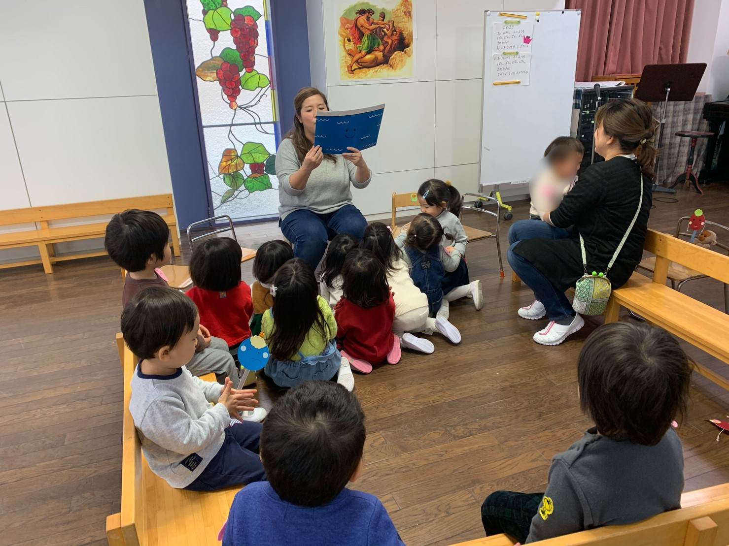もも組さんに「手に持っているものを椅子の下に置く」と、ひとつお約束をお願いすると、心を静かにしてお礼拝ができました。素敵でしたよ。