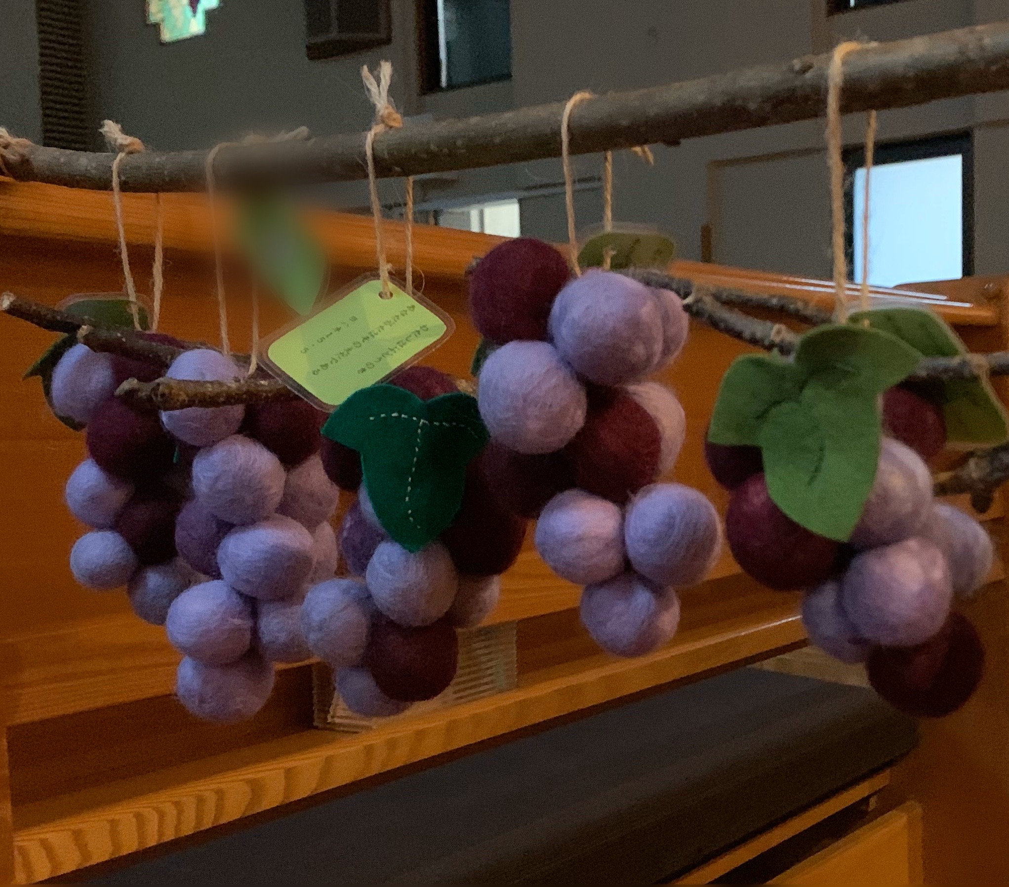 年少組の『ぶどう』は、聖書の『わたしはぶどうの木、あなたがたはその枝である』にちなみ、羊毛を使って作りました。