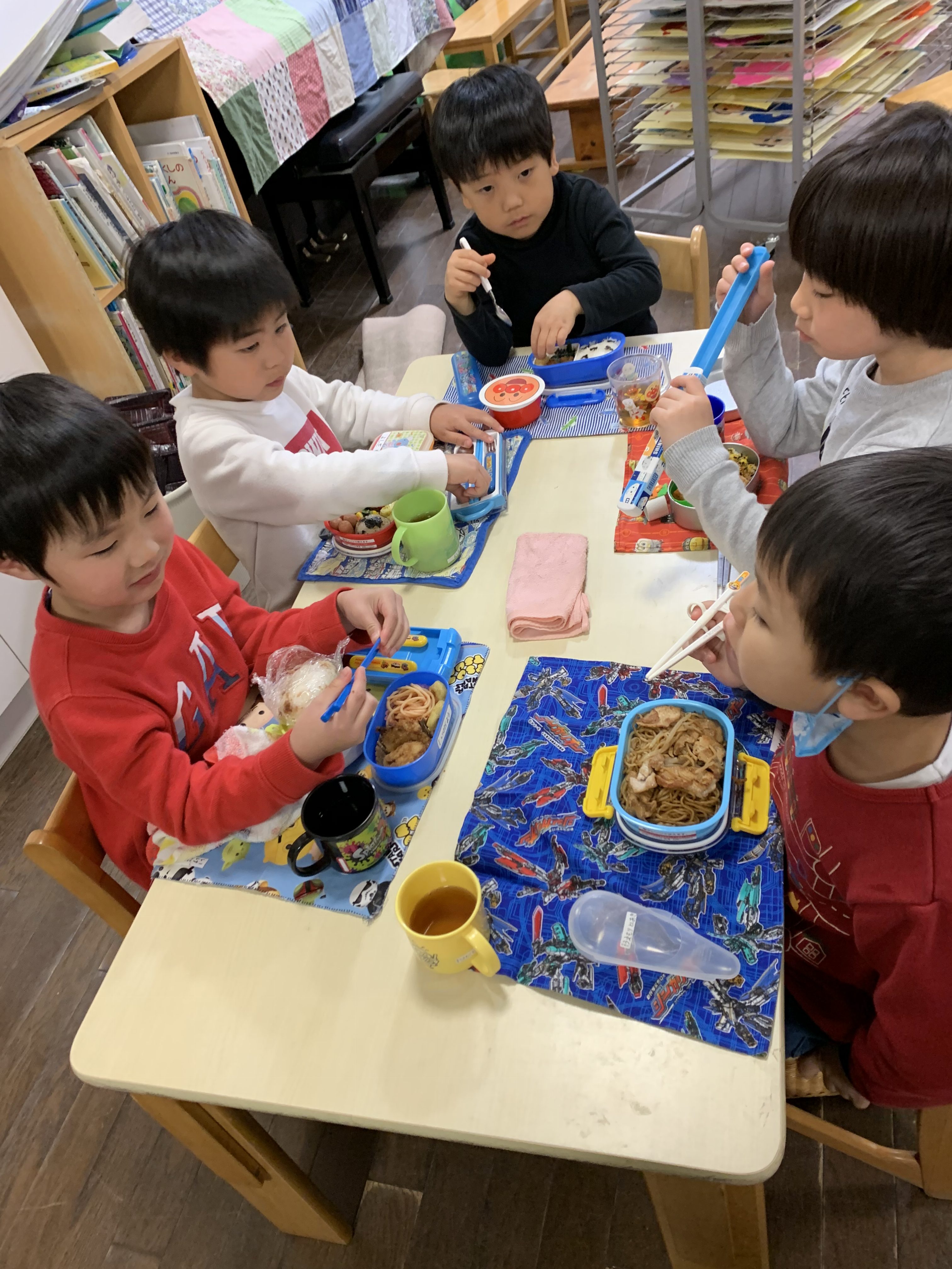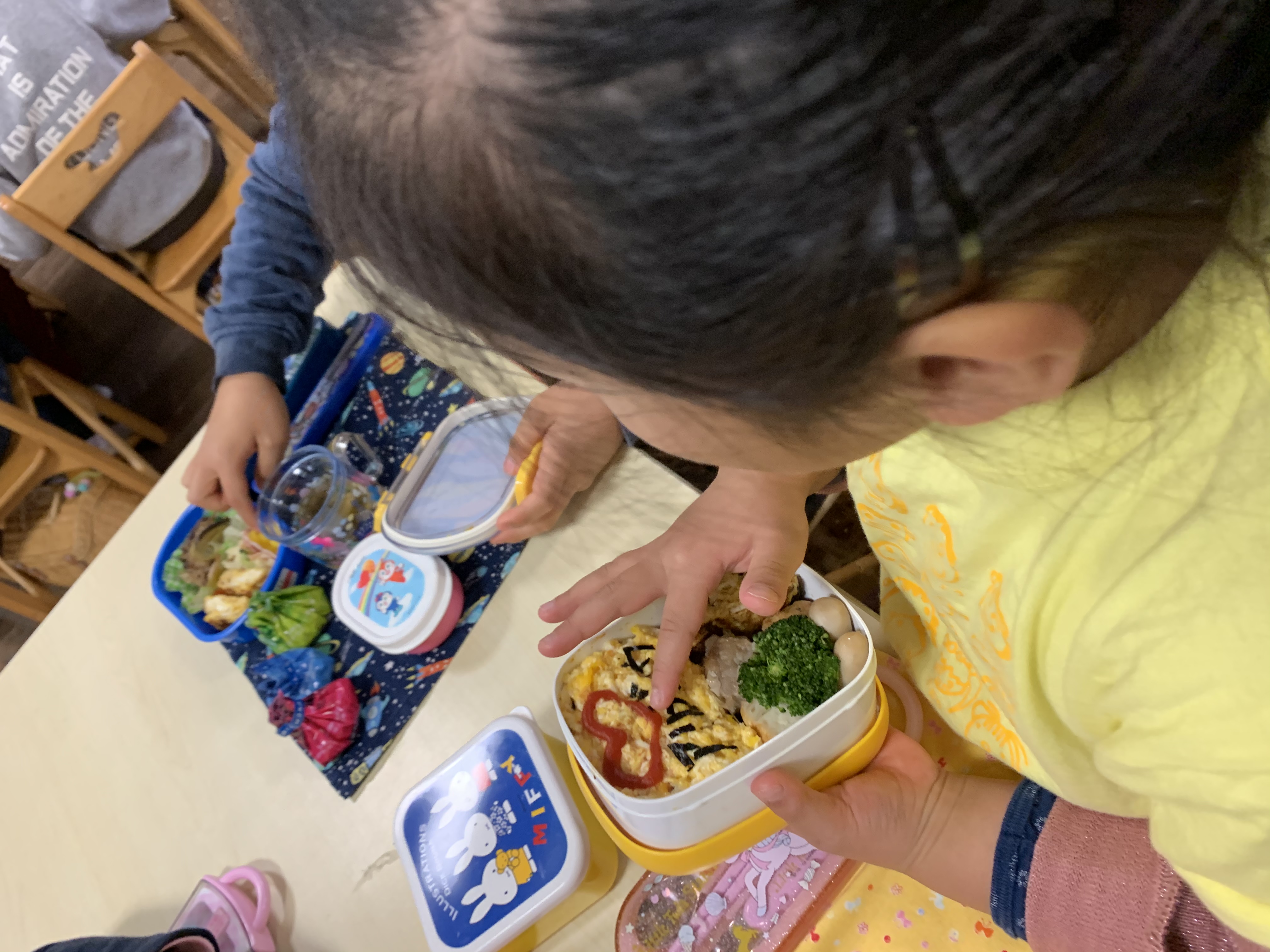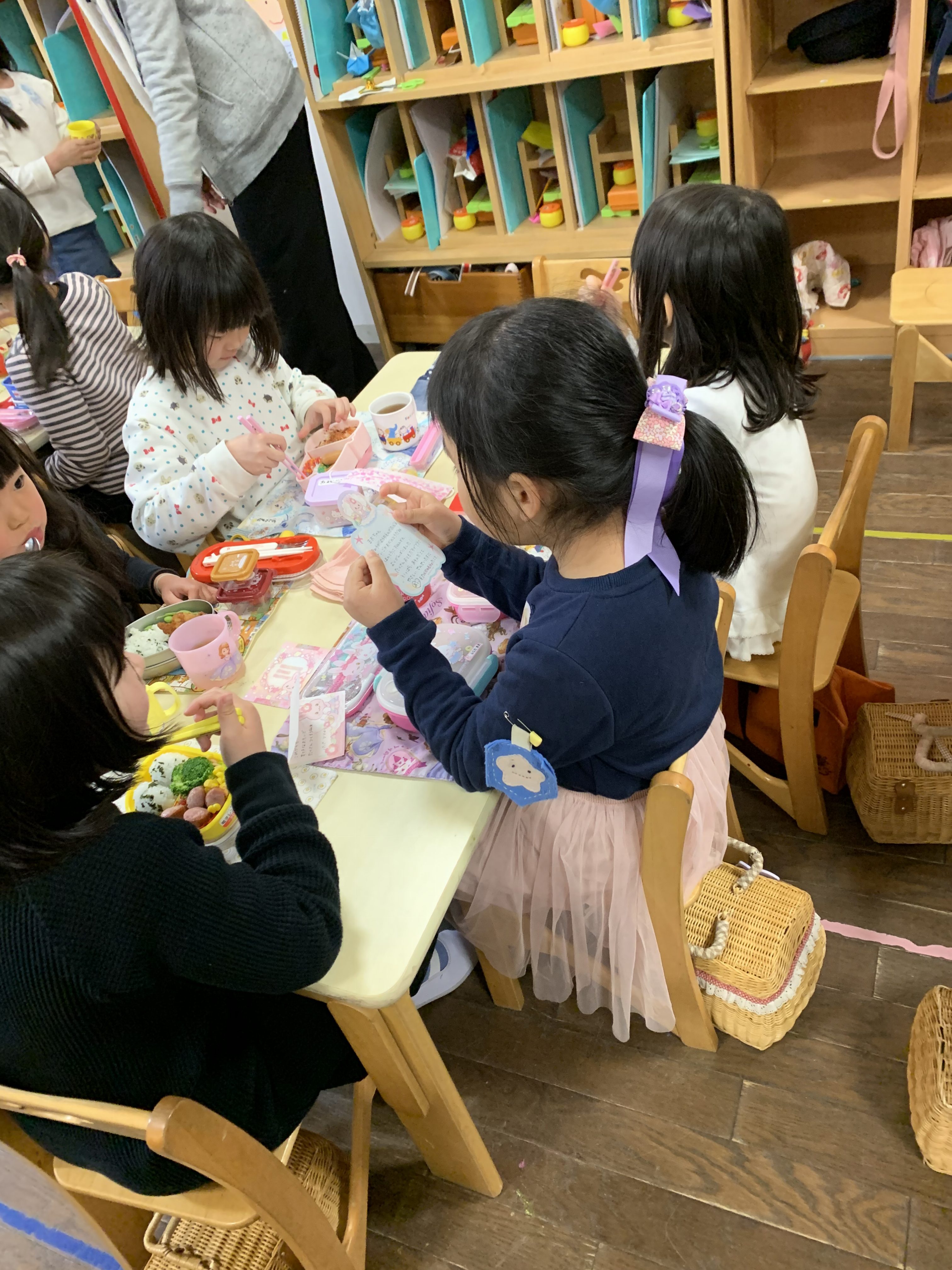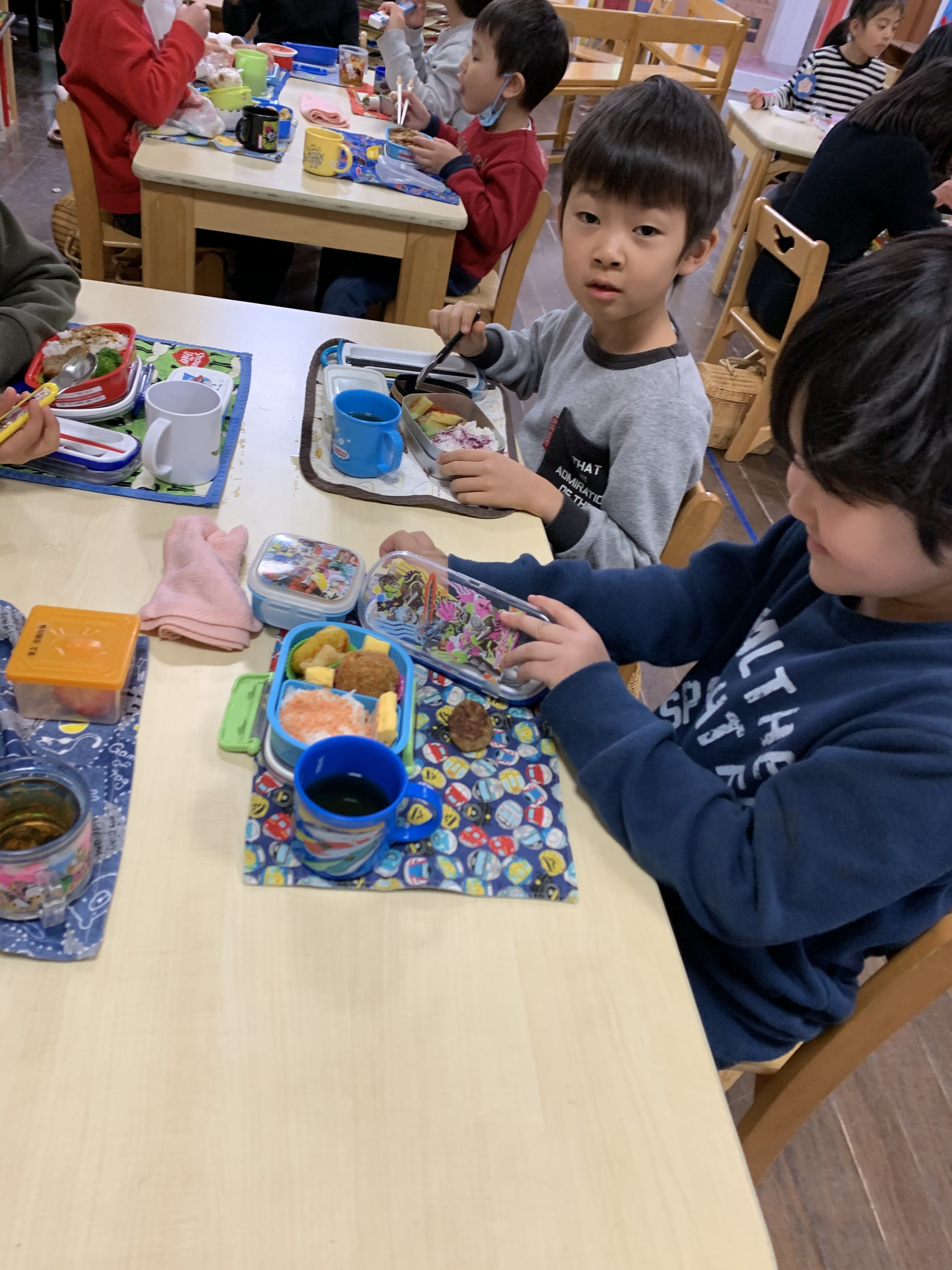 卒園式の練習も無事に終え、あっという間にお弁当。 最後のお弁当は、大好きなおかずが入っていたり、特別なデザートだったり。お母さんからのお手紙が入っていたりしましたね。