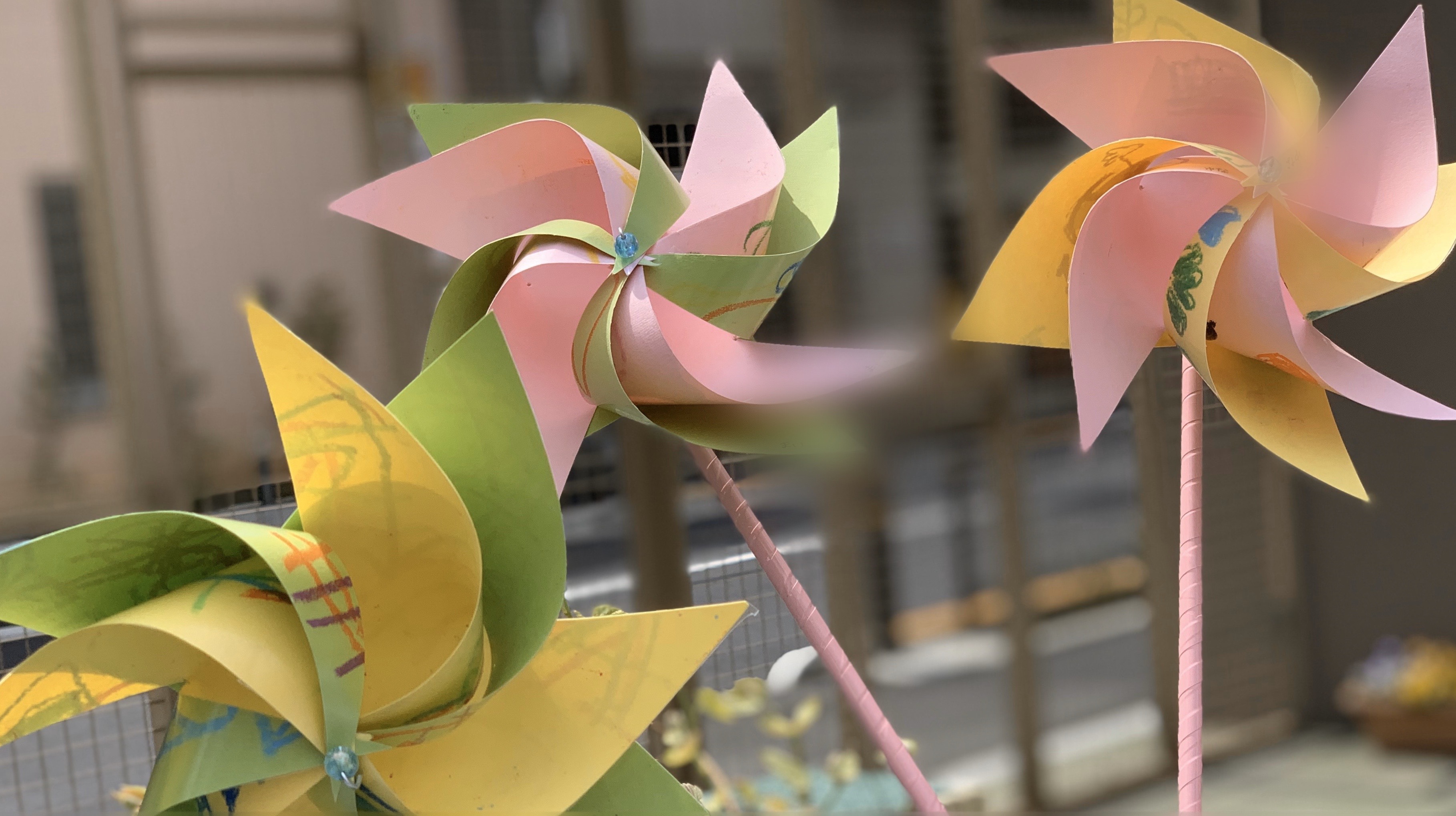 お絵描きが出来上がり、幼稚園のポストに入れてくれたものを先生が風車に完成させてくれましたよ‼︎(年少・年中組は白画用紙)